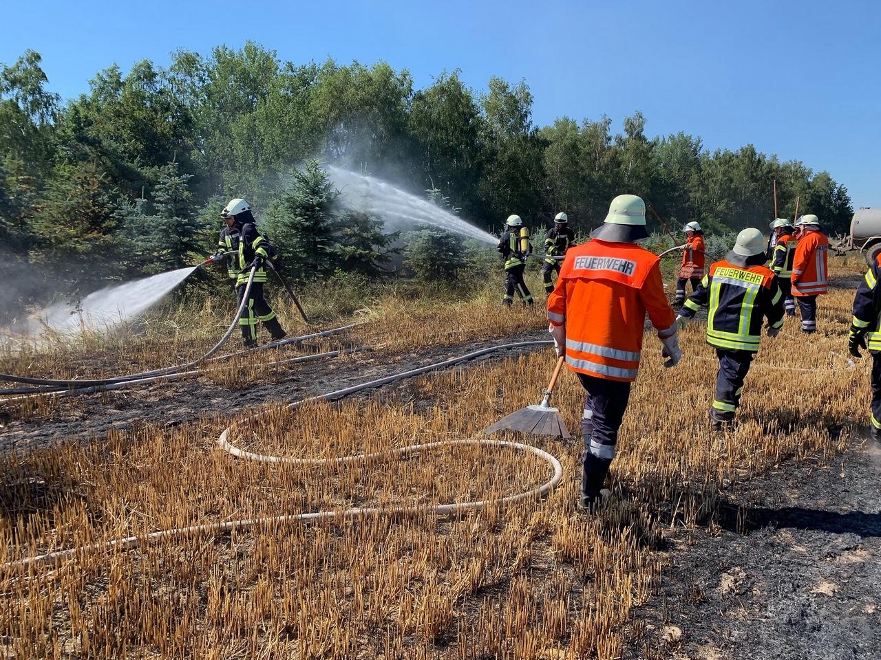 Ein Großaufgebot an Feuerwehrkräften wurde zur Einsatzstelle alarmiert. Die Feuerwehren Nartum, Winkeldorf, Steinfeld, Horstedt, Elsdorf, Gyhum, Hesedorf und Zeven rückten umgehend an um den Flammen her zu werden. Mit dem Schlauchwagen musste eine Wasserleitung über längere Wegstrecke verlegt werden. Mit mehreren C-Rohren wurde die Fläche gelöscht. Glücklicherweise waren auch einige Landwirte mit Ihren Güllefässern vor Ort. Sie brachten ebenfalls ausreichend Wasser auf das Feld um ein Ausbreiten zu verhindern. Das Übergreifen auf ein angrenzendes Waldstück konnte durch den schnellen Einsatz verhindert werden.