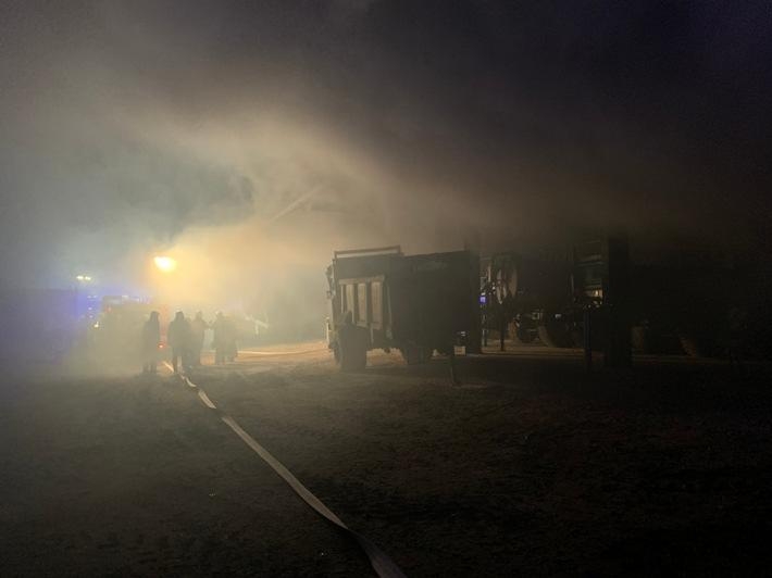 Am frühen Sonntagmorgen um 4:41 wurden die Feuerwehren Elsdorf, Gyhum, Frankenbostel, Hatzte-Ehestorf, Volkensen-Rüspel-Nindorf und Zeven zu einem Feuer in einem landwirtschaftlichen Gebäude in den Erlenweg nach Elsdorf gerufen. Dort sollte nach ersten Meldungen eine Scheune brennen. Dieses konnte von den erst eintreffenden Kräften aus Elsdorf zum Glück nicht bestätigt werden. In der offenen Gerätehalle brannte ein Wohnwagen in voller Ausdehnung, die Halle wurde durch die Hitzeeinwirkung schon in Mitleidenschaft gezogen. Zwei Trupps unter Atemschutz gingen mit zwei C-Rohren umgehend zur Brandbekämpfung vor und konnten das Feuer schnell löschen, so dass kein weiterer Schaden an dem Gebäude und den anderen Maschinen in der Halle entstehen konnte. Schnell konnte "Feuer aus" gemeldet werden und die ersten Einsatzkräfte aus dem Einsatz entlassen werden. Die Nachlöscharbeiten zogen sich noch einen Moment hin. Gegen 6:00 konnten die letzten Einsatzkräfte die Einsatzstelle wieder verlassen.