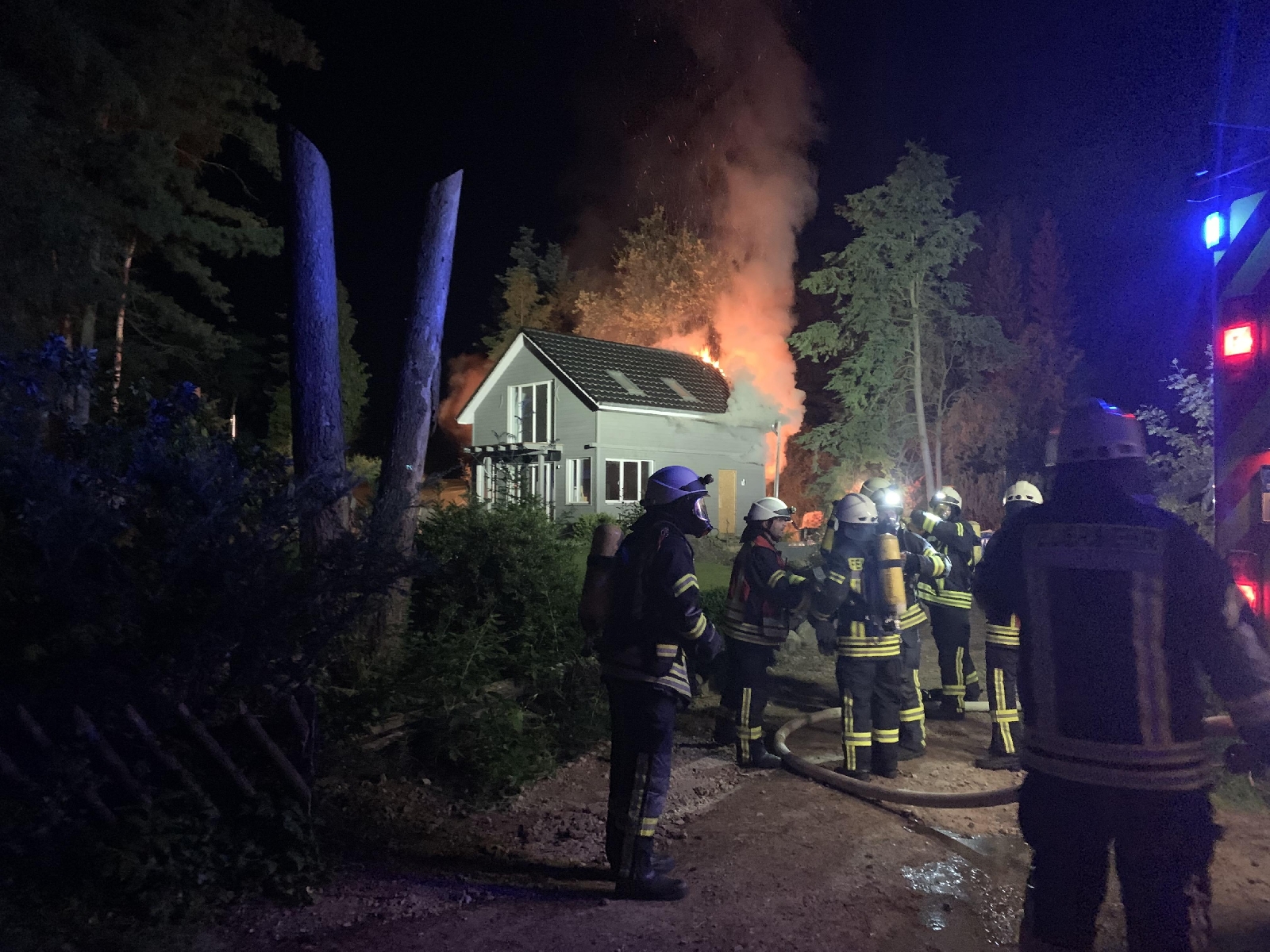 In der heutigen Nacht gegen 0:40 Uhr wurde der Feuerwehr ein Feuer in einem Holzhaus in der "Waldsiedlung" in Hatzte gemeldet. Umgehend wurden von der Leitstelle in Zeven die Feuerwehren Hatzte-Ehestorf und Elsdorf zur Einsatzstelle alarmiert. Schon auf der Anfahrt zur Einsatzstelle das Einsatzstichwort erhöht und die Drehleiter aus Zeven und die Feuerwehren Volkensen-Rüspel-Nindorf und Hamersen hinzualamiert. Vor Ort fanden die Einsatzkräfte einen Brand in der Holzfassade eines großen Holzwohnhaus vor, der sich schon bis in den Dachstuhl ausgebreitet hatte. Mit mehreren Trupps unter Atemschutz wurde von mehreren Seiten die Brandbekämpfung aufgenommen und die Fassade geöffnet. Parallel dazu wurde das Gebäude von Innen auf eine Brandausbreitung kontrolliert, dort jedoch kein Feuer gefunden. Zur Brandbekämpfung am Dach wurde die Drehleiter in Stellung gebracht und das Dach im Brandbereich geöffnet und die Flammen dort bekämpft. Da in den vom Feuer betroffenen Bereichen nicht nur die Fassade geöffnet, sondern auch die Dämmung entfernt musste, haben sich die Löscharbeiten eine Zeit lang hingezogen. Fortlaufend wurden die Bereiche mit Wärmebildkameras kontrolliert, um weitere Glutnester zum ablöschen ausfindig zu machen. Zum Teil mussten für die Nachlöscharbeiten Teile der Fassade mit Motorsägen geöffnet werden, um besser an die Glutnester ran zu kommen. Diese Arbeiten zogen sich dann bis ca. halb Vier am Morgen hin. Die Ortsfeuerwehr Hatzte-Ehestorf blieb mit einer Brandwache bis ca. 8:00 Uhr vor Ort.
