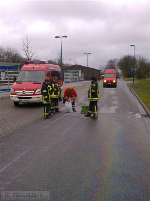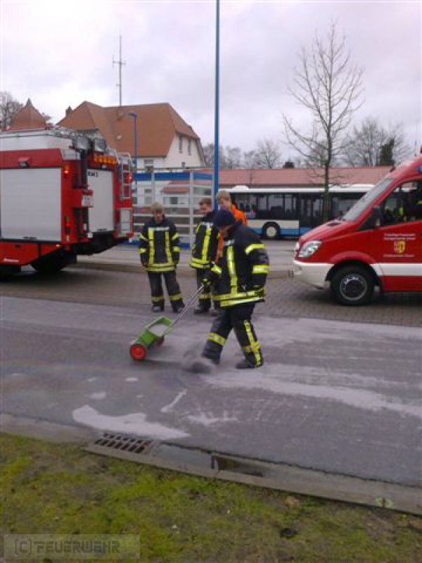 Die Ortsfeuerwehr Zeven war mit 4 Fahrzeugen und 14 Feuerwehrkameraden im Einsatz um die Ölspur mitels Ölbindemittel abzustreuen.