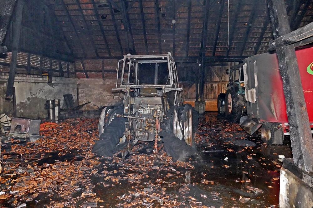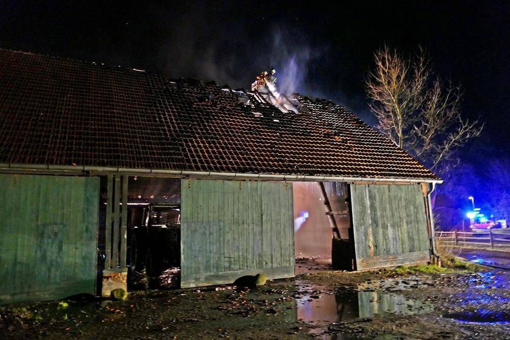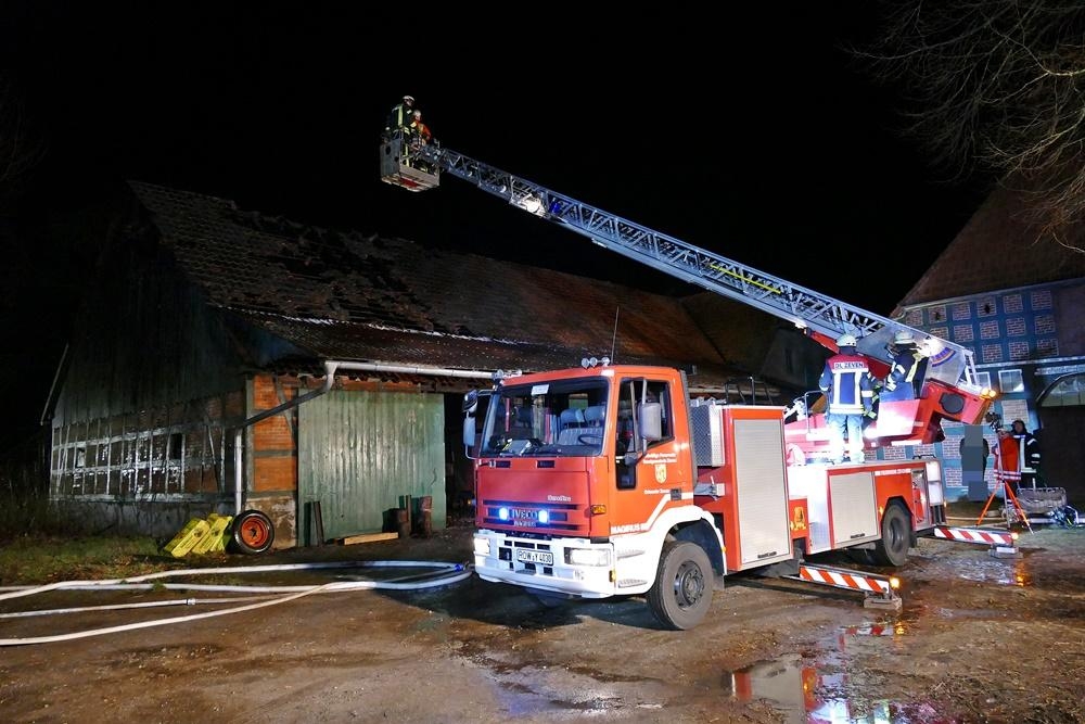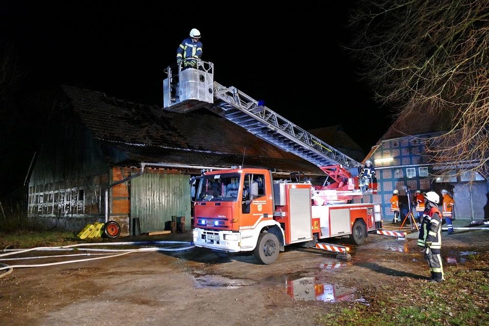 uchholz (SB) Am Donnerstag Abend den 7.März 2019 um 20:41 Uhr wurden die Feuerwehren aus Buchholz und Wilstedt zu einen Brandeinsatz nach Buchholz alarmiert. Das Alarmstichwort lautete: "F2 - brennt Scheune in der Großen Straße". Umgehend machten sich die beiden Wehren mit 5 Einsatzfahrzeugen auf dem Weg. Beim Eintreffen der ersten Kräfte brannten 3 Trecker, ein Streuanhänger für Futter und diverse in der ca. 20 x 40 m großen Halle gelagerte Werkzeuge in voller Ausdehnung. Kurze Zeit später fing durch die große Hitzeentwicklung auch die Balkenkonstruktion des Daches Feuer.