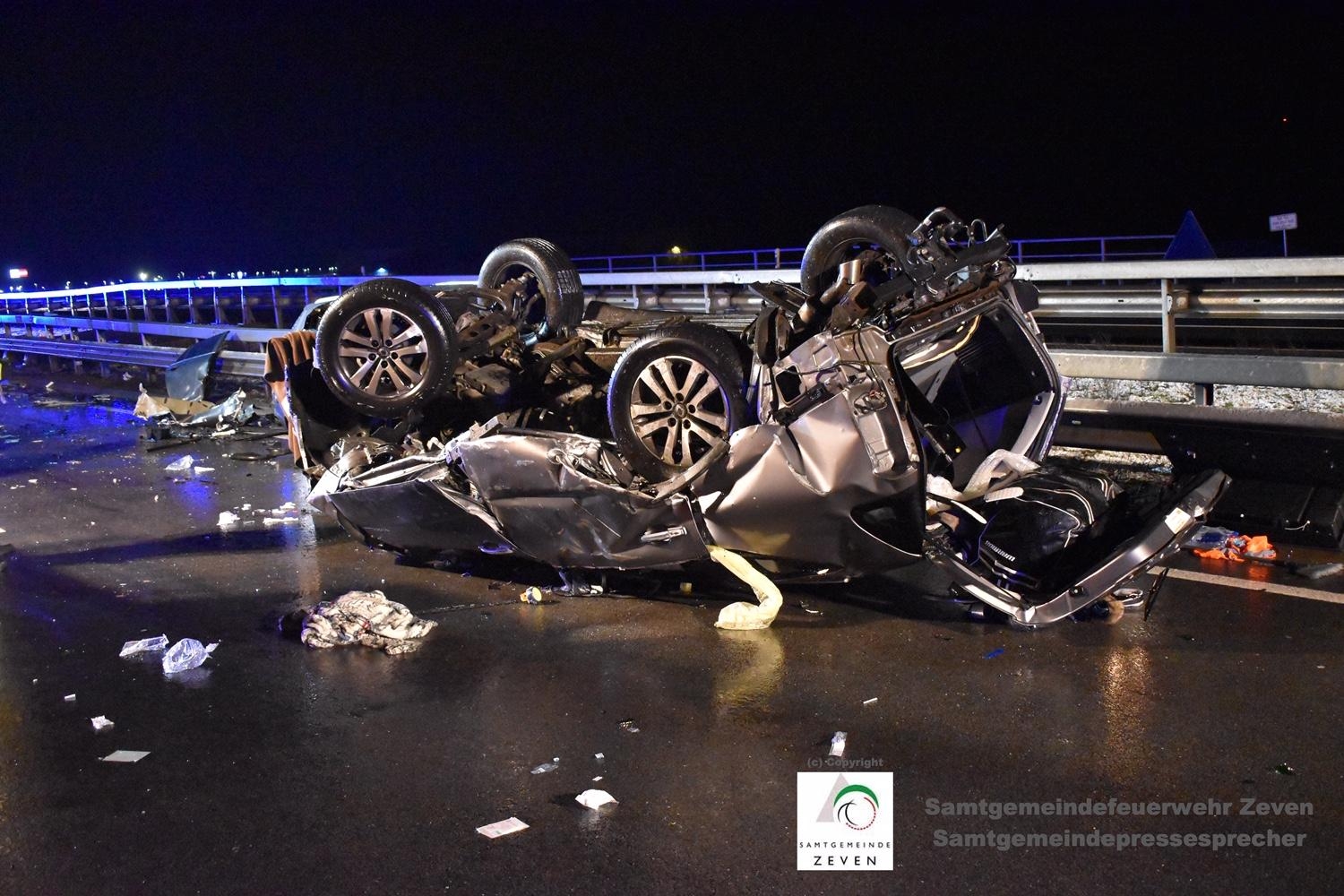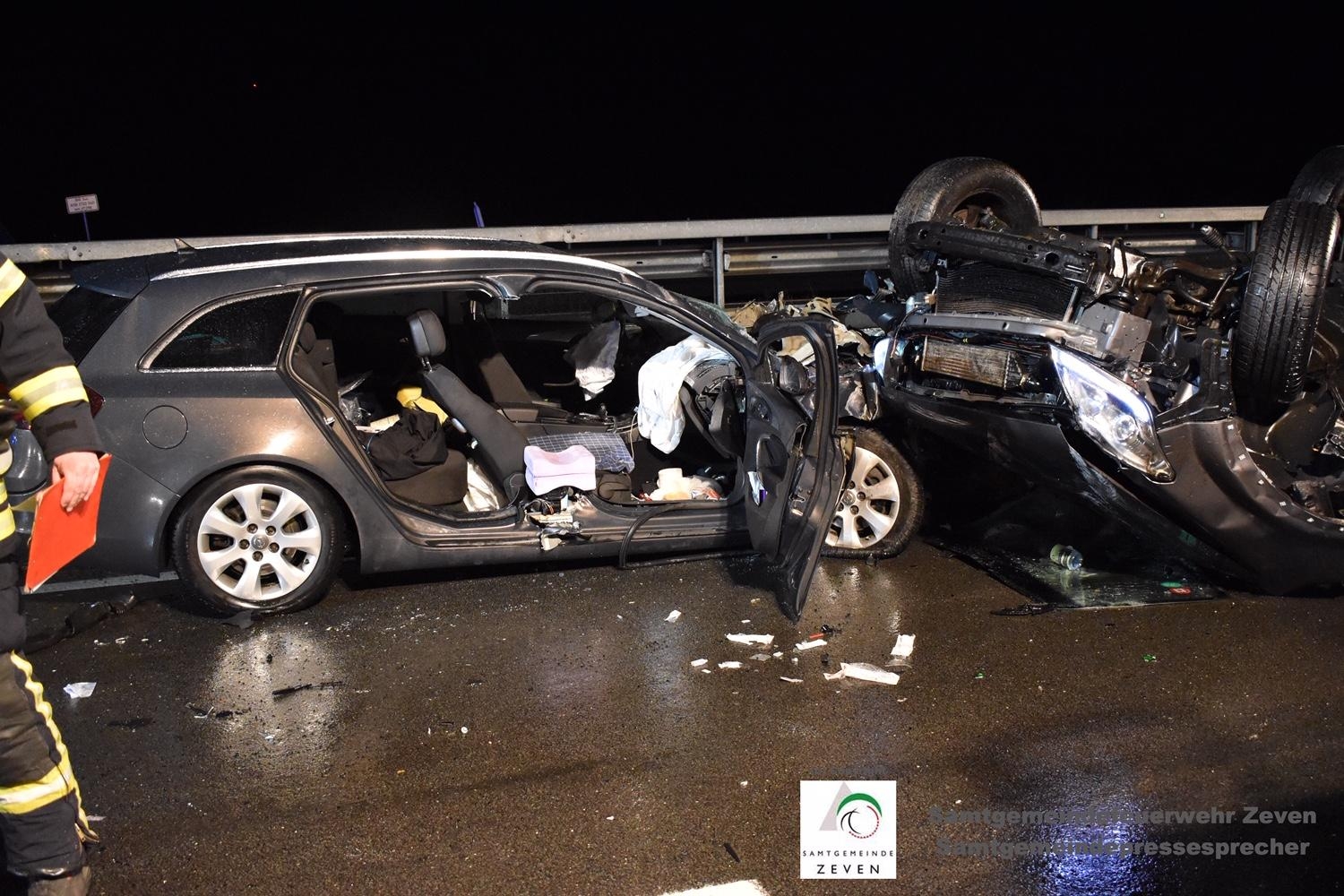 Elsdorf (tg) Am 11.03.2019 gegen 2:10 Uhr kam es auf der Autobahn A1 Fahrtrichtung Bremen, zwischen den Anschlussstellen Elsdorf und Bockel zu einem Verkehrsunfall mit mehreren beteiligten Fahrzeugen, bei denen noch mehrere Personen eingeklemmt sein sollen. Daraufhin wurden von der Leitstelle in Zeven die Ortsfeuerwehren Gyhum, Elsdorf, Zeven und der Rettungsdienst alarmiert. Den erst eintreffenden Kräften stellte sich folgende Lage dar. Ein PKW lag an der Mittelleitplanke auf dem Dach, ein weiterer PKW stand direkt an dem auf dem Dach liegenden PKW, ein Person lag auf dem Standstreifen vor einem weiteren PKW. Der Fahrer des auf dem Dach liegenden PKW war nicht in seinem massiv zerstörten PKW eingeklemmt und konnte so gerettet werden. Der Fahrer und die Beifahrerin aus dem zweiten PKW mussten befreit werden. Hierzu wurde nach Rücksprache mit dem Rettungsdienst eine große Öffnung auf der Beifahrerseite geschaffen. Nach entfernen der Tür und der B-Säule konnten die zwei Personen schonend gerettet werden. Alle drei Verletzten wurden an den Rettungsdienst übergeben. Sie wurden nach Erstversorgung in Krankenhäuser in Rotenburg, Bremen und Hamburg eingeliefert. Für die Person auf dem Standstreifen kam leider jede Hilfe zu spät, sie verstarb noch an der Unfallstelle.Da die Lage doch sehr übersichtlich war, konnten schon schnell die ersten Kräfte aus dem Einsatz entlassen werden und an ihren Standort zurückkehren. Die Ortsfeuerwehr Gyhum blieb noch bis Abschluss der technischen Rettung an der Einsatzstelle. Für die Unfallaufnahme und das Ausleuchten der Einsatzstelle blieb die Ortsfeuerwehr Elsdorf mit einem Teil der eingesetzten Kameraden vor Ort. Gegen 5:10 konnten auch diese Kräfte die Einsatzstelle wieder verlassen.Im Einsatz waren etwa 50 Einsatzkräfte von Feuerwehr mit 7 Fahrzeugen, 5 Rettungswagen, 3 Notarzteinsatzfahrzeuge, der OrgL Rettungsdienst und die Autobahnpolizei mit 3 Fahrzeugen.