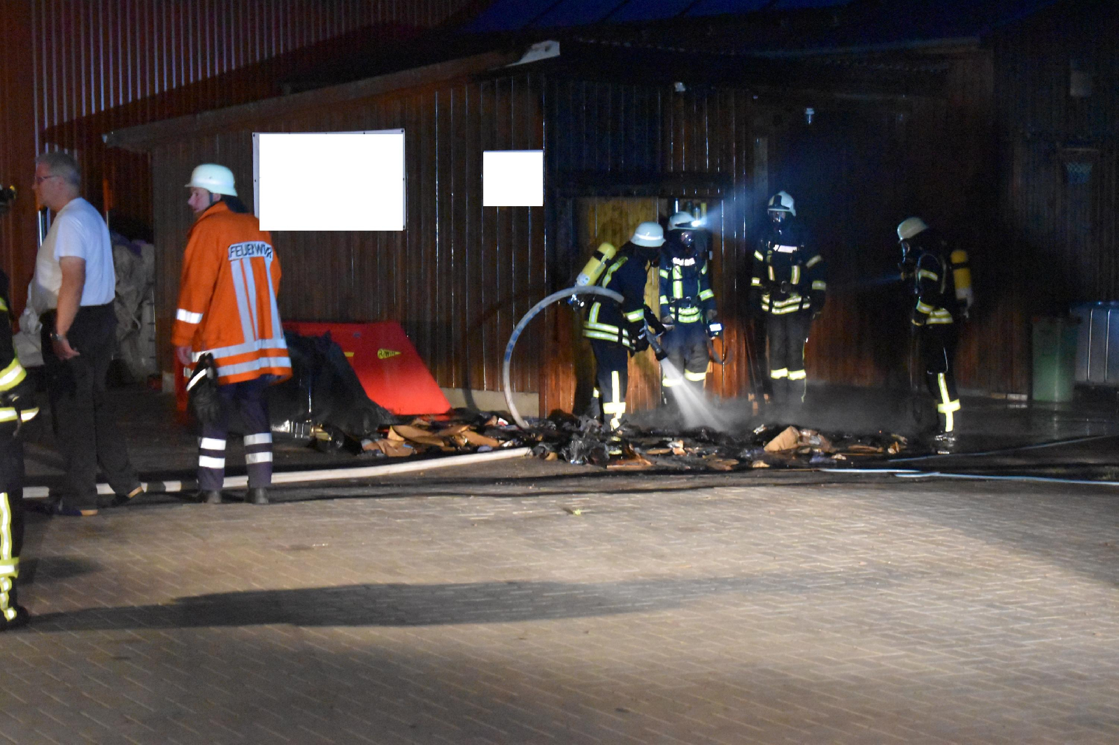 In der Nacht zu Montag gegen 4:20 Uhr kam es zu einem Feuer in Godenstedt in der Straße "Im Dorfe". Gemeldet wurde der Leitstelle in Zeven ein brennendes Gebäude. Erst eintreffende Kräfte der Feuerwehr Godenstedt fanden eine brennende 1000 l Altpapiertonne vor, die direkt am Gebäude stand. Ein beherzter Nachbar hatte mit einem Gartenschlauch schon angefangen die Tonne abzulöschen und dadurch einen höheren Schaden am Gebäude abgewendet. Die alarmierten Feuerwehren aus Godenstedt, Seedorf und Zeven brauchten somit nur noch die letzten Glutnester ablöschen, die Holzfassade zu kühlen und das angrenzende Gebäude mit einer Wärmebildkamera auf weitere Glutnester untersuchen. Da es von Seiten der Feuerwehr keine Feststellungen mehr gab, konnte der Einsatz nach gut einer Stunde wieder beendet werden. Die Feuerwehren waren mit 5 Fahrzeugen und 40 Einsatzkräften vor Ort.