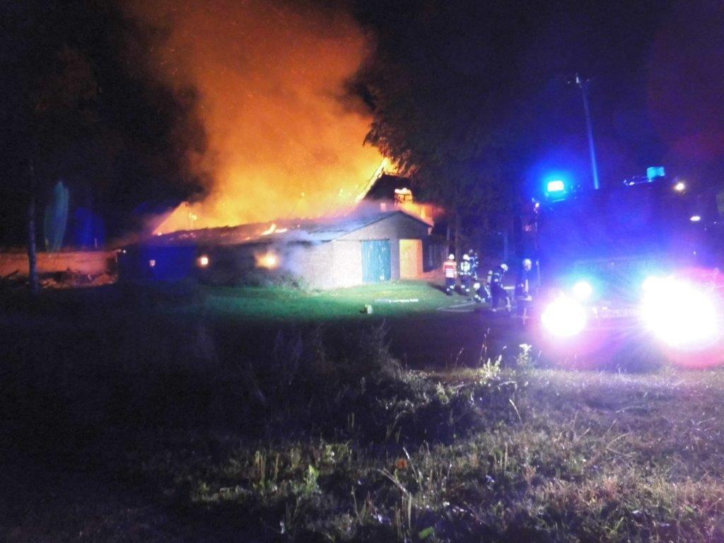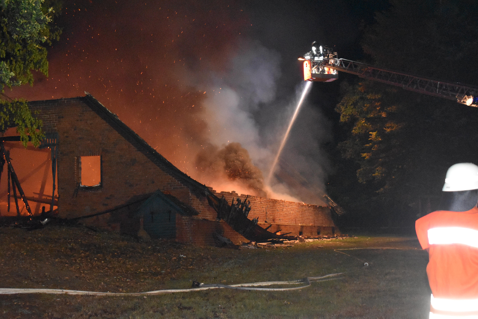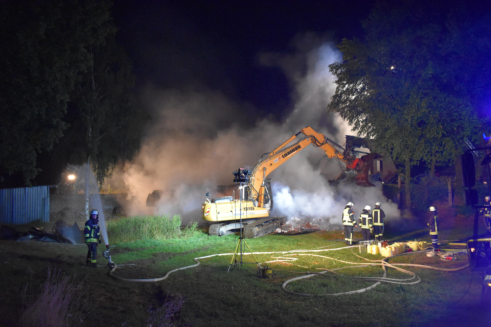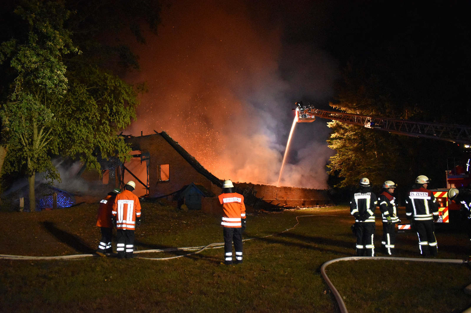 Heute Nacht um 1:37 wurden die Feuerwehren Farven, Anderlingen, Fehrenbruch, Byhusen, Selsingen und Zeven zu einem Gebäudebrand in den Farvener Ortsteil Baaste alarmiert. Dort stand eine ca. 20 x 30m große, massiv gebaute Scheune in Vollbrand. Ersteintreffende Kräfte der Feuerwehr Farven ließen umgehend weitere Kräfte aus Deinstedt, Malstedt und Ohrel nachalarmieren. Sofort wurde mit der Brandbekämpfung begonnen. Dazu wurden von mehreren Seiten insgesamt 7 C-Strahlrohre und zusätzlich ein Wenderohr über die Zevener Drehleiter eingesetzt. Später wurde noch zusätzlich ein mobiler Wasserwerfer in Stellung gebracht. Für die Löschwasserversorgung wurden in der Nähe liegende Unterflurhydranten und die ca. 1km entfernte Bever genutzt. Dank des massiven Löschwassereinsatzes konnte das Feuer schnell unter Kontrolle gebracht werden. Da sich in der Scheune große Mengen an Stroh und Feuerholz gelagert befanden, wurde noch ein Bagger organisiert, der das Gebäude Stück für Stück abgetragen und gelagertes Stroh nach außen gebracht hat. Aktuell, Stand 6:00 Uhr laufen noch die Nachlöscharbeiten, die sich wohl noch den Vormittag hinziehen werden.