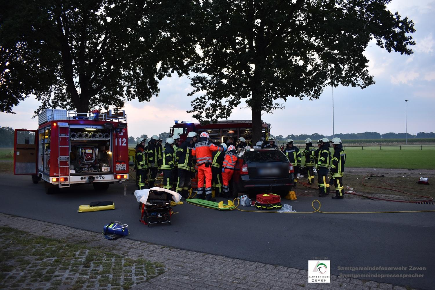 Die alarmierten Feuerwehren aus Rüspel, Elsdorf trafen kurz nach der Alarmierung vor Ort ein und bereiteten die technische Rettung vor. Nach Untersuchung durch den Notarzt, wurde Aufgrund der schwere der Verletzung, entschieden, eine Crash-Rettung durchzuführen. Die Kräfte der Ortsfeuerwehr Elsdorf begannen auf der Fahrerseite mit dem Entfernen der Tür und anschließend mit dem entfernen der B-Säule. Der inzwischen eingetroffene Rüstwagen aus Zeven übernahm parallel die Vorbereitungen zum entfernen des Fahrzeugdaches. Trotz der massiven Verformungen des Fahrzeuges an der Fahrerseite, gelang es den Einsatzkräften die verletzte Person zeitnah aus ihrer Lage zu befreien und an den Rettungsdienst zu übergeben. Auf weitere Massnahmen seitens der Feuerwehr brauchte man nicht zurückgreifen und man konnte mit dem Rückbau der Gerätschaften beginnen. Ausgelaufene Betriebsstoffe wurden mit Bindemittel aufgenommen.