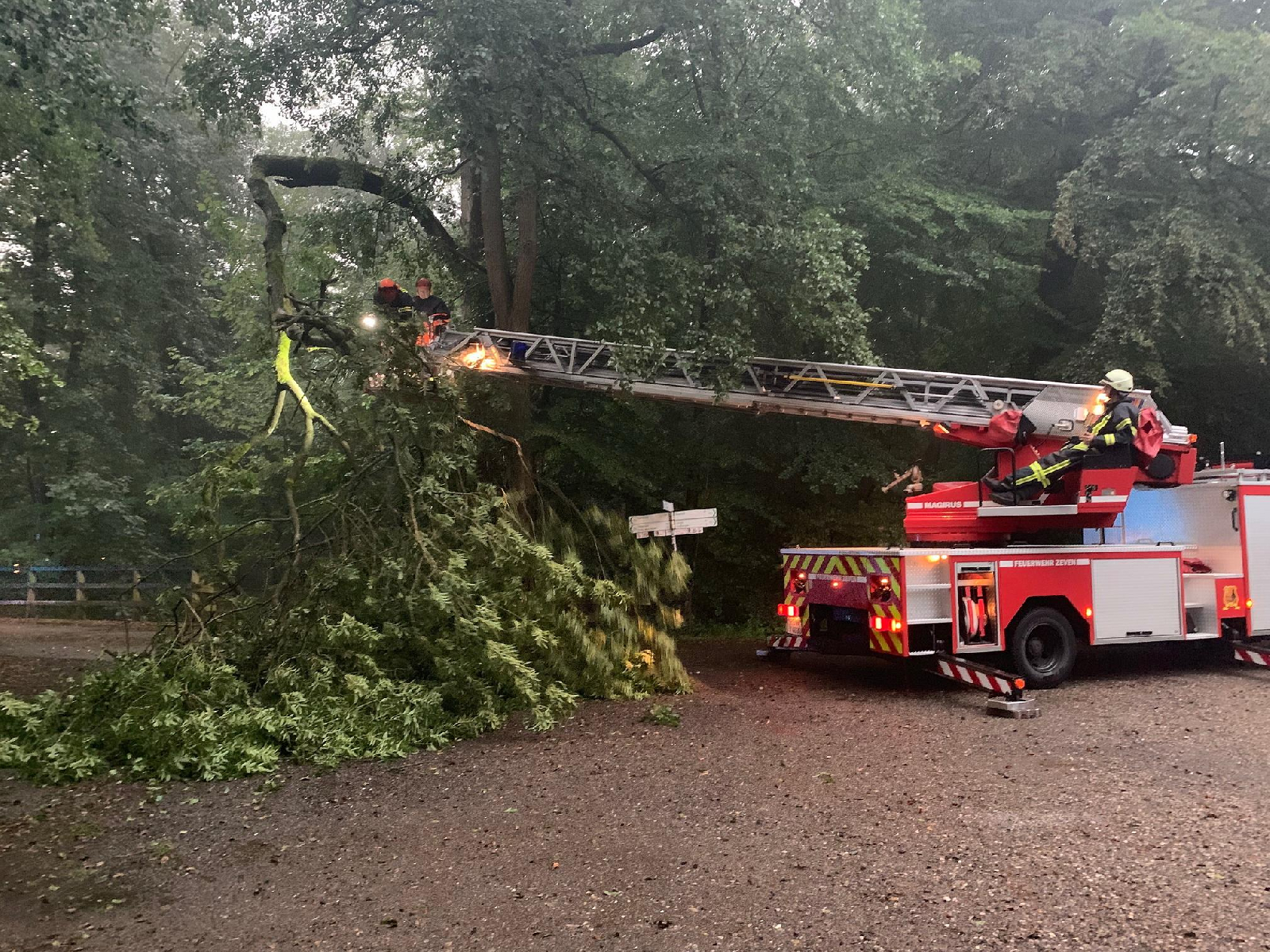 Baum ragt über Fahrbahn – Drehleiter im Einsatz