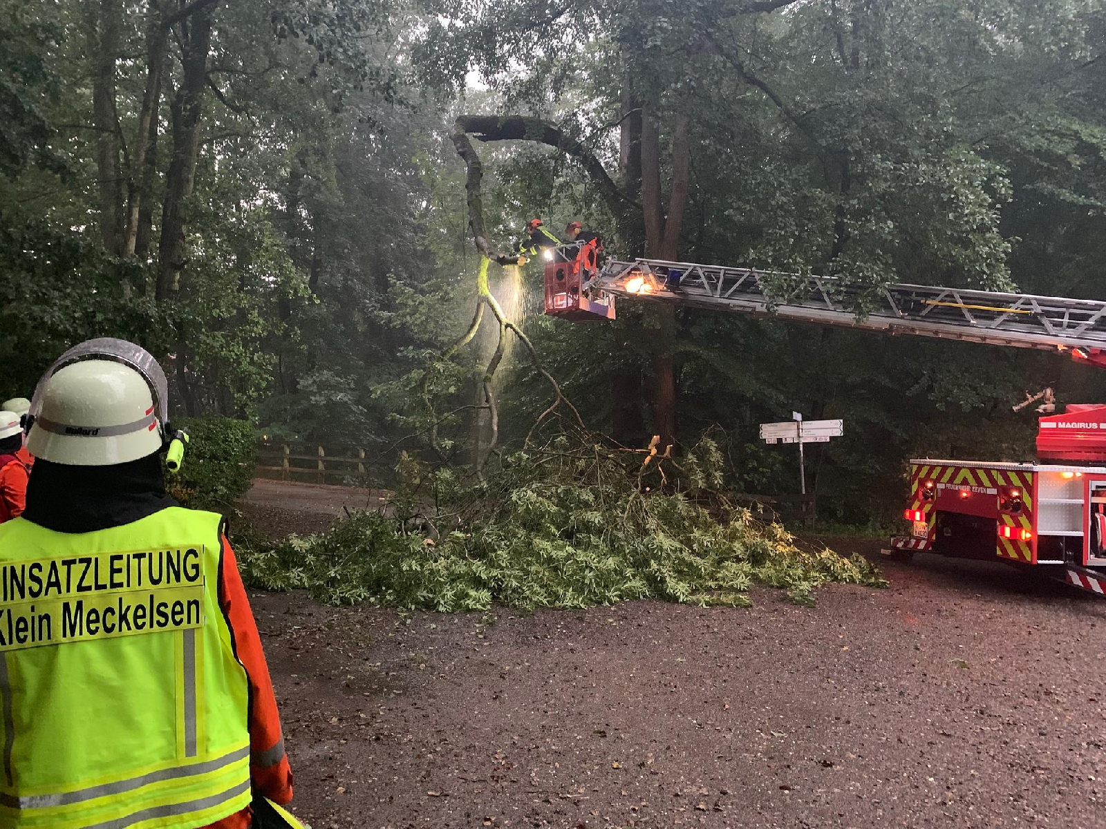 29.08.2019 Groß Meckelsen OT Kuhmühlen (as). Nach einer stürmischen Nacht mussten am Donnerstagmorgen um 6:25 Uhr die Feuerwehren Groß Meckelsen und Klein Meckelsen zu einem Hilfeleistungseinsatz ausrücken. Ein Teil eines Baumes ragte im Kuhmühler Weg im Groß Meckelsener Ortsteil Kuhmühlen über die Fahrbahn und drohte auf die Straße zu stürzen. Nach erster Erkundung war klar, dass die Gefahr nicht mit eigenen Mitteln zu beseitigen war. Die Zevener Drehleiter musste nachgefordert werden. Mittels Motorsäge wurde der Baum aus dem Drehleiterkorb Stück für Stück abgetragen. Somit war nach rund einer Stunde die Gefahr soweit beseitigt. Im Einsatz waren die drei Feuerwehren mit rund 30 Einsatzkräften. Gegen 8 Uhr war die Fahrbahn für den Verkehr wieder freigegeben.