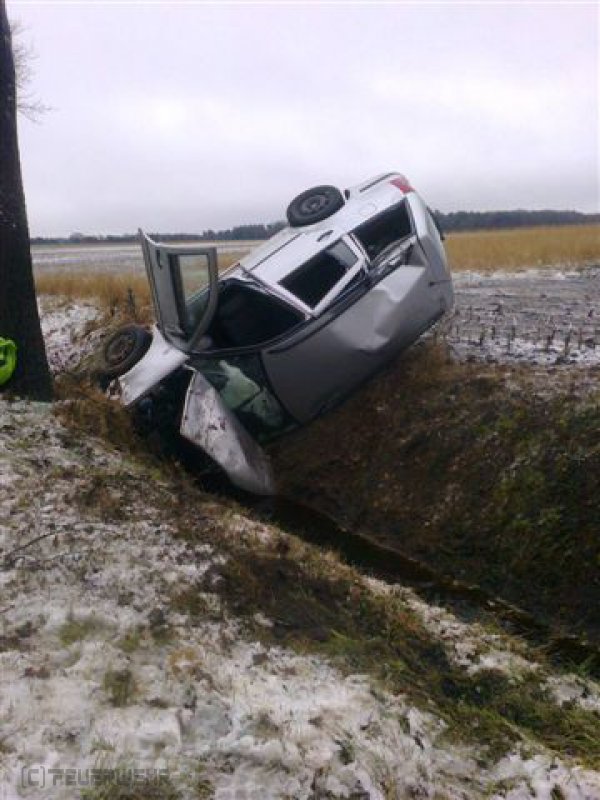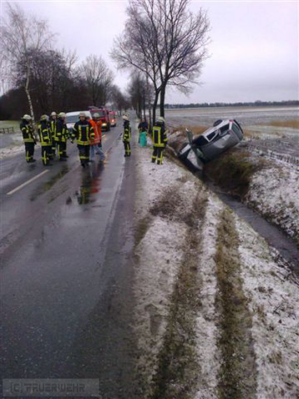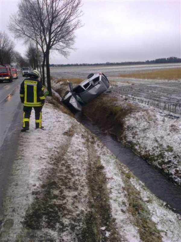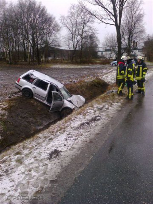 Ein PKW ist nach dem Überholen eines LKW aufgrund von Schneematsch von der Straße abgekommen und in einem Entwässerungsgraben neben der Fahrbahn zum Stehen gekommen.