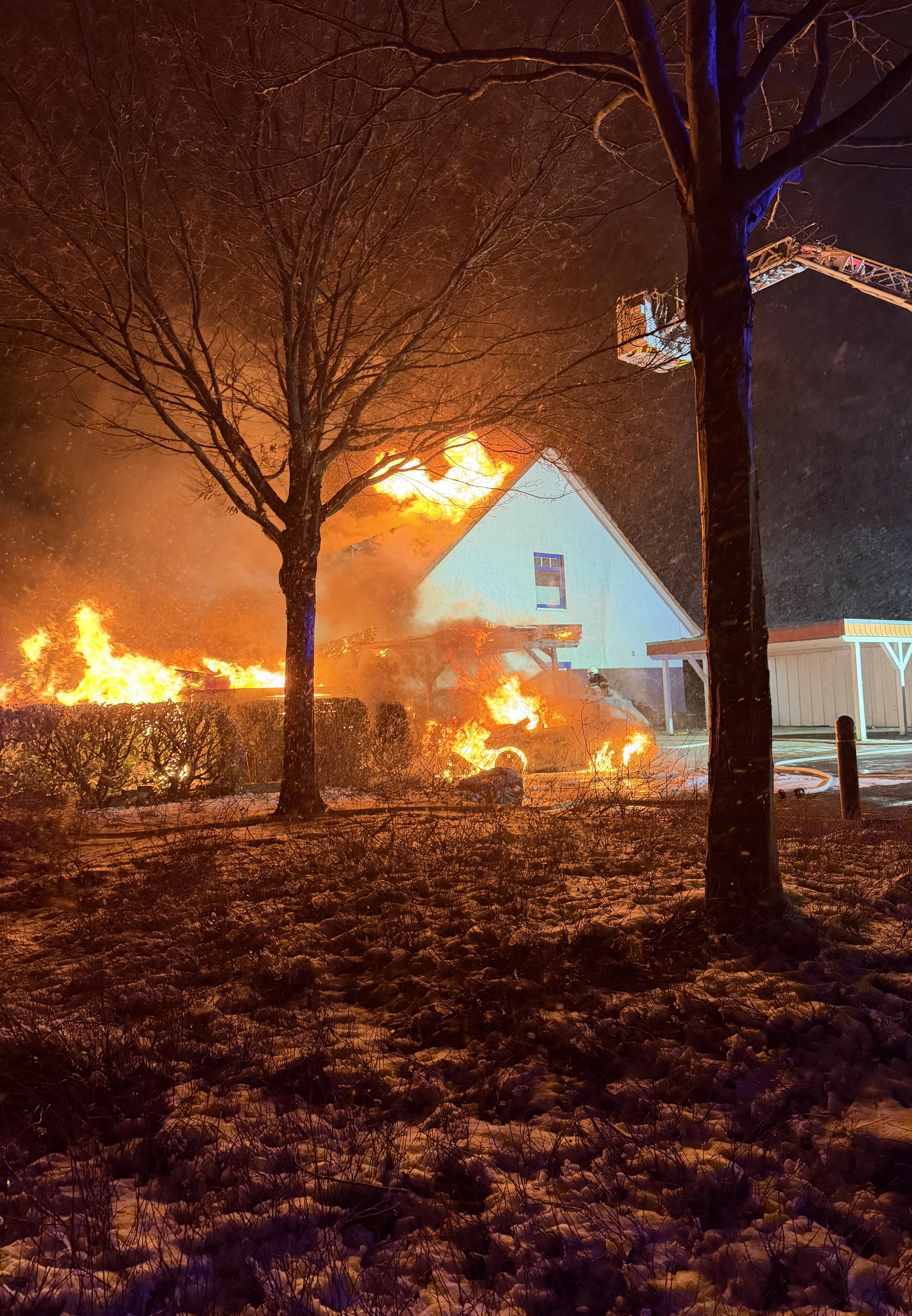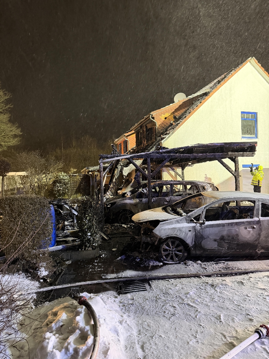 Zeven (cm). Zu einem ausgedehnten Brand der Alarmstufe F2-Y (später F3) wurden am 16.02.2026 um 1.58 Uhr mehrere Feuerwehren nach Zeven alarmiert. Beim Eintreffen der ersten Einsatzkräfte stand ein Carport bereits in Vollbrand. Die Flammen hatten zu diesem Zeitpunkt auf das angrenzende Wohnhaus übergegriffen.