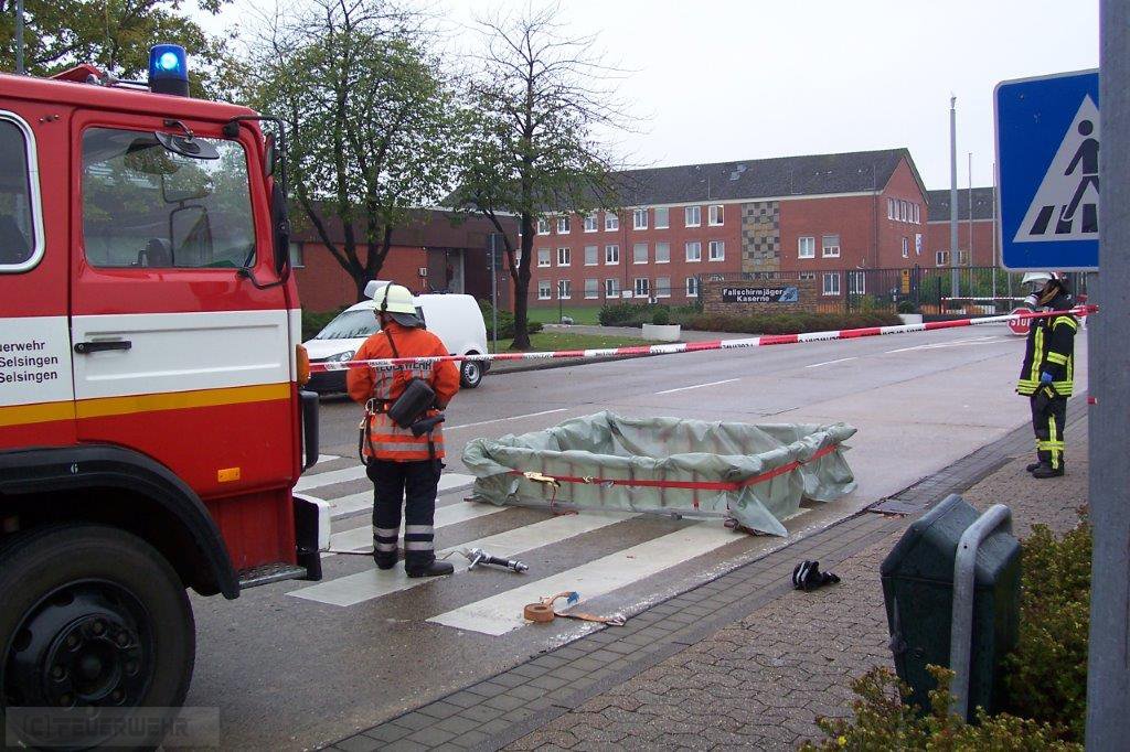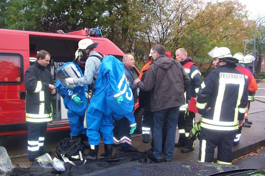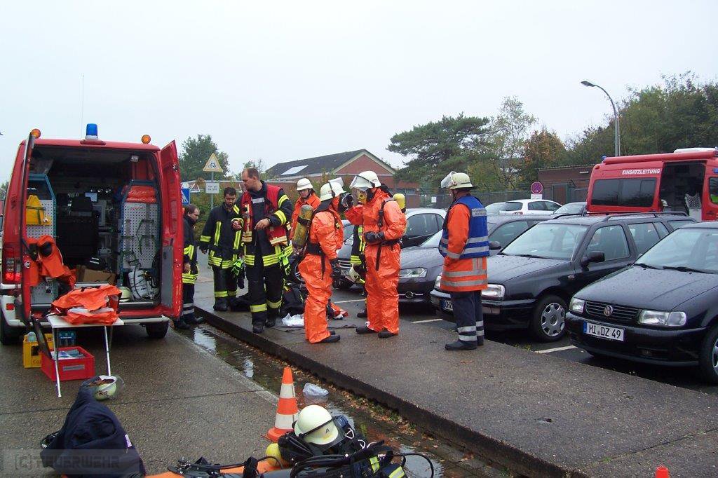 Seedorf(tw) Aufgrund eines technischen defektes an einer Chlordosieranlage im Keller des Schwimmbades in der Kaserne Seedorf, kam es am 13.10.14 um 08:30 Uhr zu einem Gefahrguteinsatz für die Ortsfeuerwehren aus Seedorf,Selsingen,Parnewinkel,Zeven sowie Teile des Gefahrgutzuges des Landkreises,zeitgleich wurde auch noch ein Rettungswagen der Rettungswache Zeven an die Einsatzstelle alarmiert. Aus der defekten Chlorleitung gelangten geringe Menge Chlor in eine Sicherheitsauffangwanne in der sich Reste von Schwefelsäure befanden, dies führte zu einer chemischen Reaktion in dem Keller. Die Einsatzkräfte führten unter Vollschutz (Chemikalienschutzanzüge) diverse Messungen in dem Keller des Schwimmbades durch, neutralisierten das Gemisch mit Wasser und belüfteten den Keller. Aufgrund der längeren Einsatzdauer und weil ein Zivielangestellter mit dem Rettungswagen transportiert worden ist, wurde zur Sicherstellung für die Einsatzkräfte die SEG Rettung Mitte zur Bereitstellung mit einem RTW alarmiert. Nach ca. 4 Stunden konnte der Einsatz beendet werden.