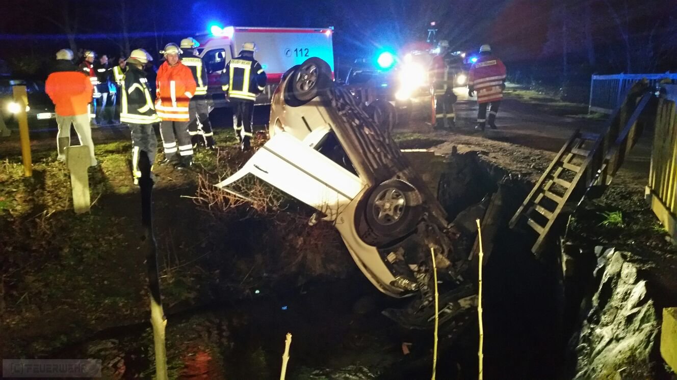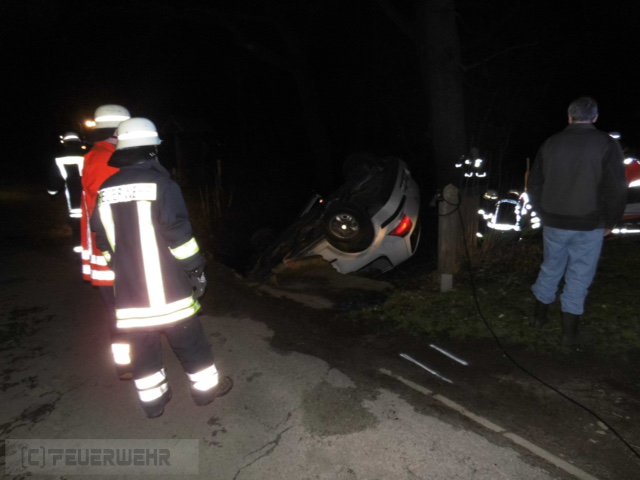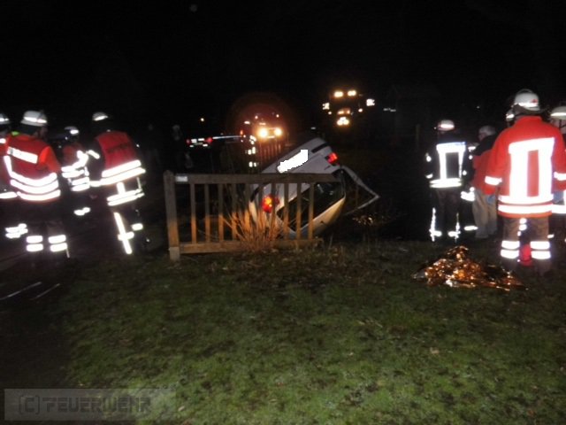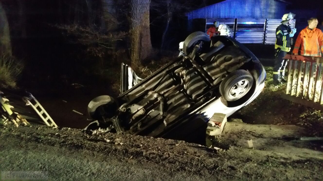 PKW im Wassergraben,mehrere Personen eingekl.