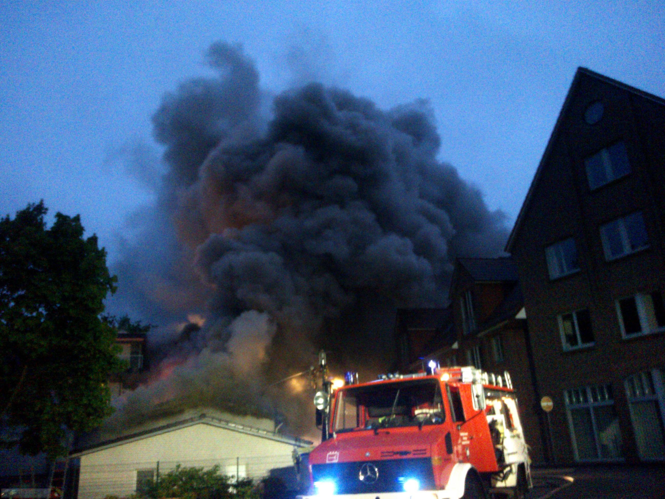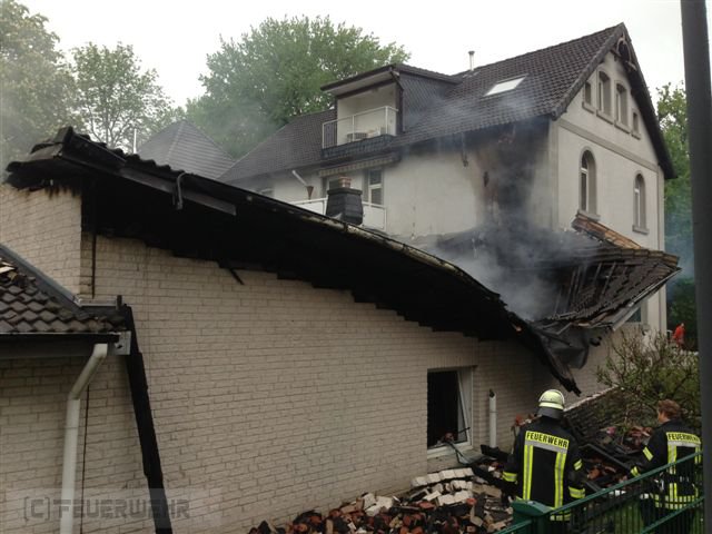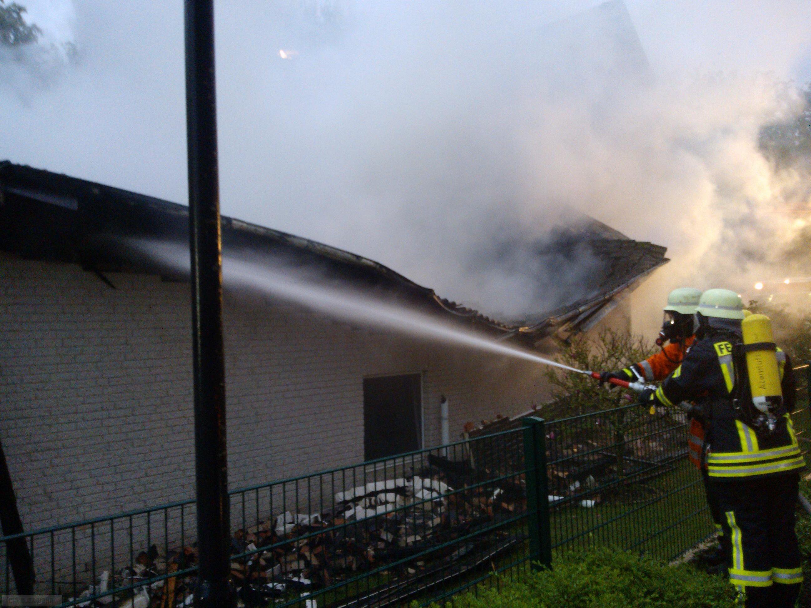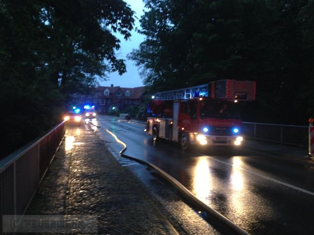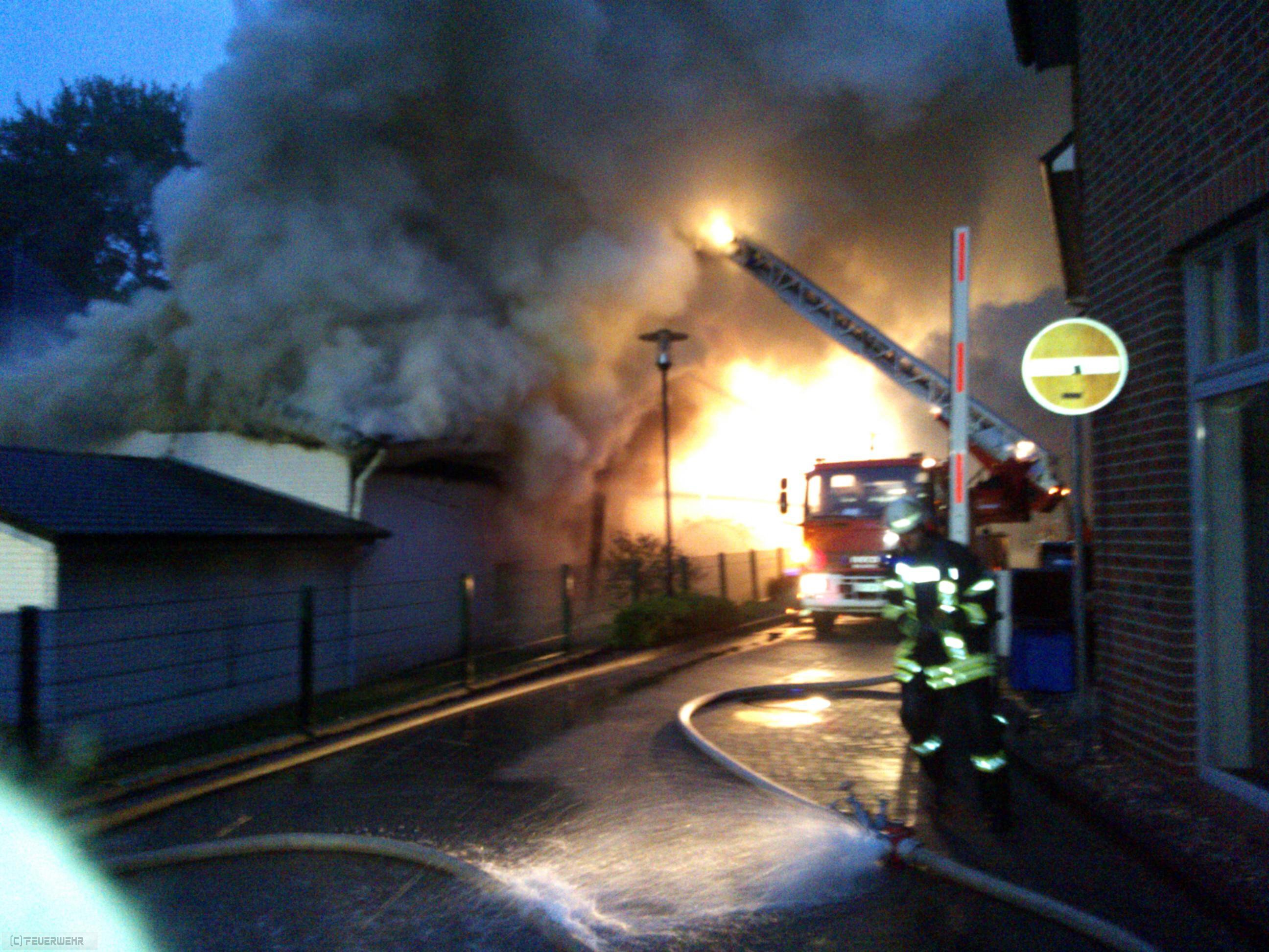 Zeven(oh)Am Samstagmorgen, den 18.05.2013 wurde die Zevener Feuerwehr um 04.28 Uhr zu einem Brandeinsatz bei einem Bestattungsunternehmen in der Labesstraße alarmiert.Ein aufmerksamer Taxifahrer hatte den Qualm bemerkt und den Notruf abgesetzt.Bereits nach sechs Minuten trafen die ersten Kräfte ein. Die Labesstraßee war bereits in dichten Rauch gehüllt, weshalb das Einsatzstichwort erhöht und weitere Kräfte zum Einsatzort beordert wurden.Das Einsatzobjekt bestand aus einem Haupthaus mit Wohnungen und einem Anbau, welcher zu betrieblichen Zwecken genutzt wurde. Aus bislang ungeklärter Ursache kam es im Anbau zu einem Feuer. Dichter Qualm drang unter dem Dach hervor, im weiteren Verlauf kam es zu einer Durchzündung der brennbaren Gase. Beiderseits des Anbaus wurde eine Riegelstellung aufgebaut, um das Haupthaus zu schützen und eine weitere Brandausbreitung zu verhindern. Die Personen aus dem Wohngebäude konnten sicher nach draußen geleitet werden, sodass keine Menschenrettung durchgeführt werden musste. In dem Anbau befanden sich noch zwei Särge mit verstorbenen Personen, diese konnten durch die Feuerwehr jedoch frühzeitig aus dem Gebäude geborgen werden, bevor diese Schaden nahmen.Aufgrund der Beschädigungen durch das Feuer, stürzten Teile der Außenmauer und des Daches vom Anbau ein, sodass dieser schließlich völlig zerstört wurde. Das Haupthaus konnte von der Feuerwehr erfolgreich geschützt werden. Wegen zahlreicher versteckter Glutnester musste der Anbau mit einem Bagger abgebrochen werden, sodass diese sicher gelöscht werden konnten. Um 06.34 Uhr kam die Lagemeldung "Feuer unter Kontrolle", um 10.33 Uhr konnte schließlich „Feuer aus“ gemeldet werden. Die Nachlösch- und Aufräumarbeiten dauerten bis in die Mittagsstunden.Insgesamt war die Feuerwehr mit über 110 Einsatzkräften und 20 Fahrzeugen im Einsatz, 22 Atemschutztrupps wurden zur Brandbekämpfung eingesetzt. Im Einsatz waren die Feuerwehren Heeslingen, Brauel, Badenstedt, Brüttendorf, Wistedt, Wiersdorf, Weertzen, Bremervörde (Drehleiter) und Zeven, sowie der Gefahrgutzug mit dem Gerätewagen Atemschutz. Außerdem waren die Polizei, der Rettungsdienst und die Stadtwerke Zeven im Einsatz. Die Bäckerei Latzel aus Zeven versorgte die Einsatzkräfte während ihres mehrstündigen Einsatzes mit Brötchen und Kaffee.Der laufende Betrieb des Bestattungsunternehmens sei durch den Brandschaden nicht beeinträchtigt.