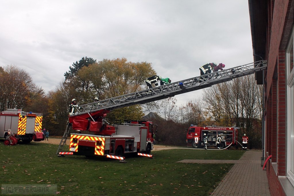 Nachdem die Feuerwehren über Sirene und Meldeempfänger alarmiert wurden, traf die Feuerwehr Klein Meckelsen als Erstes an der Einsatzstelle ein. Einsatzleiter Thomas Schnackenberg erkundete den Bereich umgehend. Sofort leitete er die Menschenrettung über Steckleitern ein. Parallel gingen mehrere Trupps unter Atemschutz ins Gebäude vor. Gleichzeitig trafen weitere Feuerwehren an der Einsatzstelle ein. Die Feuerwehr Sittensen unterstütze mit Atemschutzgeräteträgern bei der Menschrettung und im weiteren Verlauf bei der Brandbekämpfung. Die Ippensener und Groß Meckelsener Feuerwehr hatte die Aufgabe eine Wasserversorgung zum nahe gelegenen Hydranten aufzubauen. Später traf auch die Drehleiter der Feuerwehr Zeven ein. Sie mussten Kinder aus dem Obergeschoss retten. Die Jungen und Mädchen verhielten sich sehr vorbildlich. Nach rund 90 Minuten war das Übungsszenario so weit abgearbeitet. Glücklicherweise handelte es sich alles nur um eine Alarmübung, dabei wurde niemand verletzt.