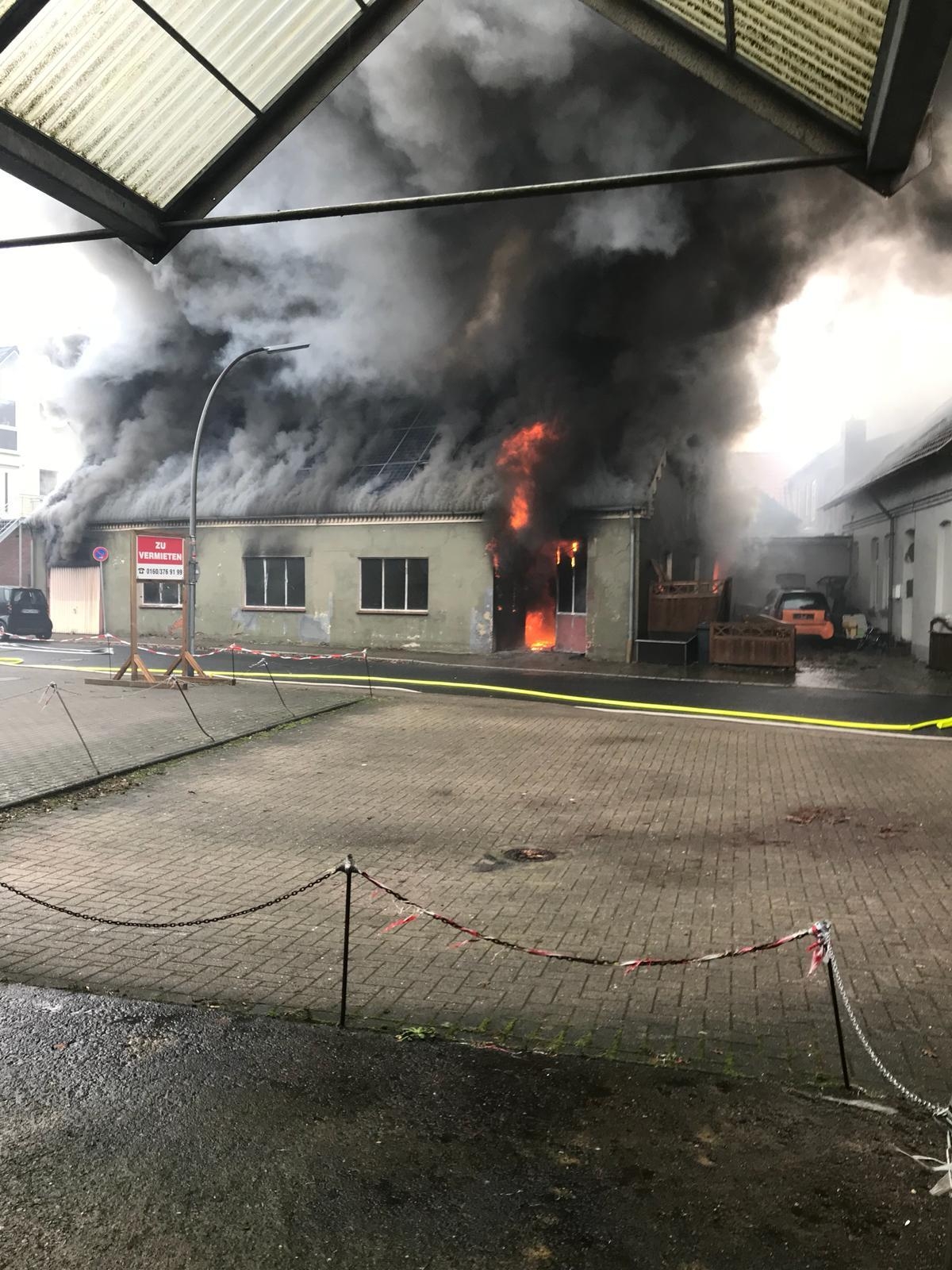 Ein ca. 8 x 15m großes Werkstattgebäude in Massivbauweise brannte im Erdgeschoss in voller Ausdehnung, die Flammen griffen schon über die hölzernen Zwischendecke auf das Dach über. Angrenzende Gebäude waren aufgrund der engen Bebauung in dem Bereich akut gefährdet. Ein Innenangriff war zu diesem Zeitpunkt nicht mehr möglich. Eine Person, die in der Werkstatt gearbeitet hatte, konnte sich vor eintreffen der Feuerwehr selber in Sicherheit bringen.Durch die Besatzung des LF 20 wurde umgehend eine Brandbekämpfung und eine Riegelstellung zum Nachbargebäude vorgenommen. Weitere Trupps gingen von der Gebäuderückseite zur Brandbekämpfung vor. Zur Absicherung der Nachbargebäude wurden von verschiedenen Stellen an Vorder- und Rückseiten Trupps mit C-Strahlrohren eingesetzt. Zeitweise waren 6 C-Rohre, 2 B-Rohre und das Wenderohr von der Drehleiter im Einsatz. Die Wasserversorgung dafür wurde aus umliegenden Hydranten sicher gestellt.Nach ca. 20 Minuten stürzte der eine Giebel des Gebäudes ein und es kam zu einer massiven Flammen- und Hitzestrahlung, die eines der Nachbargebäude bedrohte. Ein übergreifen der Flammen auf dieses Gebäude konnte aber erfolgreich verhindert werden. Lediglich einige Fensterscheiben an der Hausseite sind durch die Hitze gesprungen bzw. beschädigt worden.Zwischenzeitlich wurde die Alarmstufe auf „Feuer 4“ erhöht, um genügend Atemschutzgeräteträger an der Einsatzstelle zur Verfügung zu haben. Von der Feuerwehrtechnische Zentrale in Zeven kam der Gerätewagen Atemschutz mit Ersatzflachen an die Einsatzstelle.Erste Löscherfolge zeigten sich nach etwas über einer halben Stunde, das Feuer unter Kontrolle war nach etwa einer Stunde. Das Gebäude wurde im Anschluss von der Drehleiter aus mit Löschschaum abgelöscht um dem Feuer den Sauerstoff zu entziehen und die letzten Glutnester zu ersticken.Durch eine ortsansässige Baufirma wurde ein Bagger zur Verfügung gestellt um das einsturzgefährdete Gebäude einzureissen. Im Anschluss wurden noch die letzten Glutnester aufgesucht und abgelöscht.Im Anschluss wurde die Einsatzstelle noch einmal kontrolliert und an die Polizei übergeben.Einsatzende nach sämtlichen Aufräumarbeiten und herstellen der Einsatzbereitschaft war ca. 17.30 Uhr Im Einsatz waren ca. 120 Einsatzkräfte von Feuerwehr, DRK und Polizei.