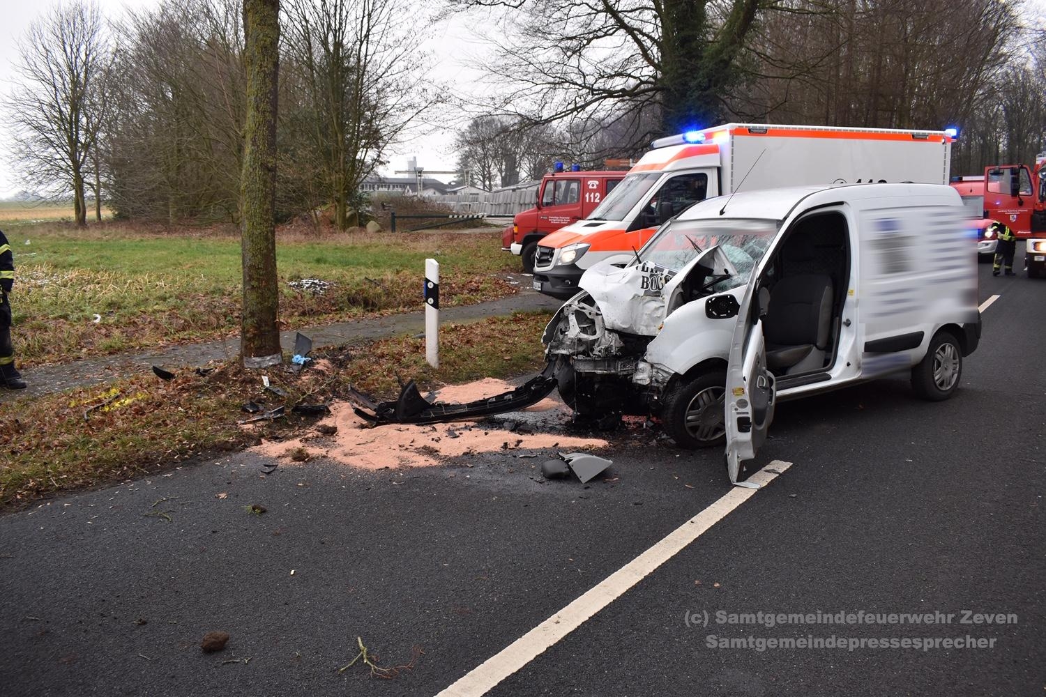 Gyhum (tg) Am 01.02.2019 um 13:49 Uhr wurden die Feuerwehren Gyhum, Elsdorf, Zeven, der Rettungsdienst und die Polizei zu einem Verkehrsunfall mit eingeklemmter Person auf die K112 zwischen Gyhum und Nartum gerufen.Den erst eintreffenden Kräften stellte sich folgende Lage dar. Ein Kleintransporter war aus unbekannten Gründen auf gerader Strecke nach Links von der Fahrbahn abgekommen und dort frontal mit einem Baum kollidiert. Anschließend schleuderte das Fahrzeug wieder auf die Fahrbahn zurück und blieb dort stark deformiert stehen. Der Fahrer war in seinem Fahrzeug eingeschlossen, aber nicht eingeklemmt.Nach eintreffen des Rettungsdienstes und des ebenfalls alarmierten Rettungshubschrauber Christoph Weser, wurde der Verunfallte nach eingehender Untersuchung durch die Notärztin schonend aus dem Fahrzeug gerettet und anschließend mit dem Rettungswagen ins Krankenhaus gebraucht.Die Feuerwehr Gyhum blieb noch bis zum eintreffen des Abschleppunternehmens vor Ort und stellte anschließend die ausgelaufenen Betriebsstoffe ab. Alle anderen eingesetzten Feuerwehren konnte die Einsatzstelle vorher verlassen.Im Einsatz waren etwa 40 Einsatzkräfte von Feuerwehr, Rettungsdienste und Polizei.Von Seiten der Feuerwehr können keine Angaben bezüglich der Unfallursache und Schadenshöhe gemacht werden.