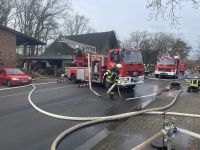 Umgehend gingen mehrere Trupps unter Atemschutz zur Brandbekämpfung ins Gebäude vor. Mit der ebenfalls alarmierten Drehleiter aus Zeven und über Steckleitern musste gleichzeitig die Dachhaut aufgenommen werden, um an den Brand heranzukommen. Parallel wurde eine umfangreiche Wasserversorgung zu mehreren Hydranten aus der Umgebung aufgebaut. In dem Gebäude brannte lediglich Heu und Stroh. Ein Vollbrand konnte dank des schnellen Eingreifens der Feuerwehren verhindert werden. Später wurde für die Nachlöscharbeiten Löschschaum eingesetzt. Mittels Druckbelüfter ist das Gebäude von Rauch befreit worden. Mehrere Wärmebildkameras mussten eingesetzt werden, um die Brandstelle auf versteckte Glutnester zu kontrollieren.