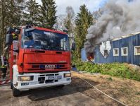 Um 13:00 Uhr wurde dann die Feuerwehr Borchel wieder alarmiert. Gemeldet wurde eine Rauchentwicklung am gelöschten Objekt vom Vormittag. Als die Einsatzkräfte an der Einsatzstelle eintrafen, stand das gesamte Gebäude in Vollbrand. Umgehend wurde das Einsatzstichwort von "Feuer 1" auf "Feuer 3" erhöht. Umliegende Feuerwehren wurden alarmiert, darunter auch wieder die Drehleiter aus Rotenburg. Nachgefordert wurde dann im frühen Einsatzverlauf die Drehleiter aus Zeven, um von zwei Seiten den Brand von oben zu löschen. Auch wurden, aufgrund der mäßigen Löschwasserversorgung an der Einsatzstelle einige Tanklöschfahrzeuge aus der Umgebung hinzugezogen. Parallel wurde einer Wasserentnahmestelle am Feuerwehrhaus in Borchel eingerichtet, um die Fahrzeuge im Pendelverkehr immer wieder zu befüllen.
