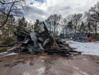 Das Feuer wurde dann von außen von insgesamt vier Trupps unter Atemschutz mit zwei C und einem B-Rohr gelöscht. Auch drei Wasserwerfer kamen zum Einsatz, zwei von den Drehleitern und ein mobiler. Im weiteren Verlauf wurde das abgelöschte Objekt mit einem massiven Schaumteppich eingedeckt, um Glutnester zu ersticken. Danach wurden die Trümmer mithilfe eines Baggers abgetragen, um weitere versteckte Flammen und Glutnester aufzuspüren und abzulöschen.