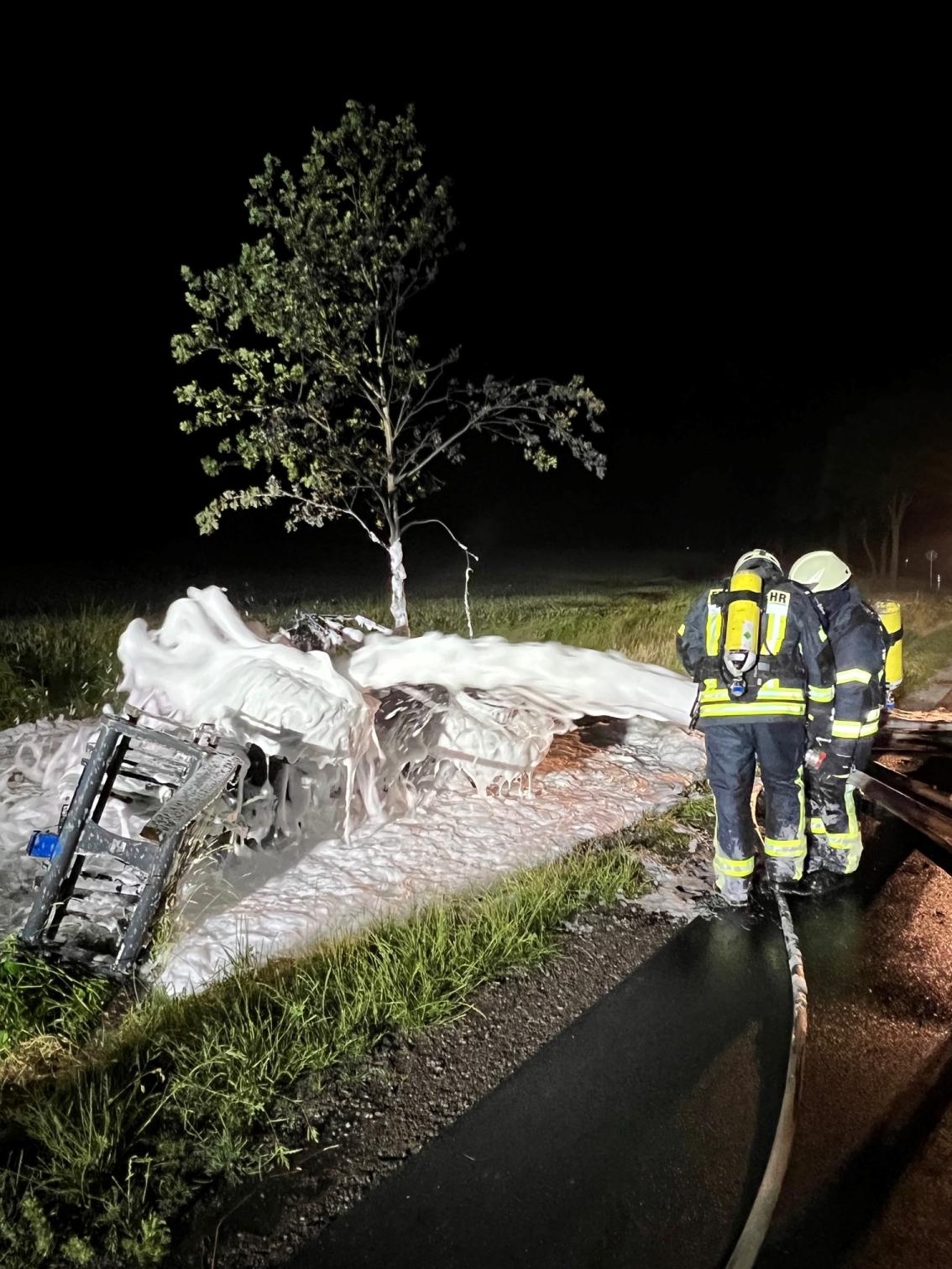 Nachdem der Radlader soweit gelöscht und gekühlt war, konnte mit einem Schaumangriff begonnen werden. Mittels Mehrzweckschaumrohr wurde über dem Radler ein Schaumteppich aufgetragen, um ein erneutes Entzünden zu verhindern. Dieser wurde abschließend mit einer Wärmebildkamera kontrolliert.