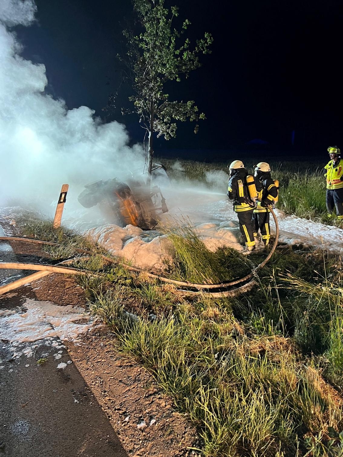In der Nacht zum Samstag wurden um 23:54 Uhr mehrere Feuerwehren mit der Meldung ,,Brennt Trecker" alarmiert.