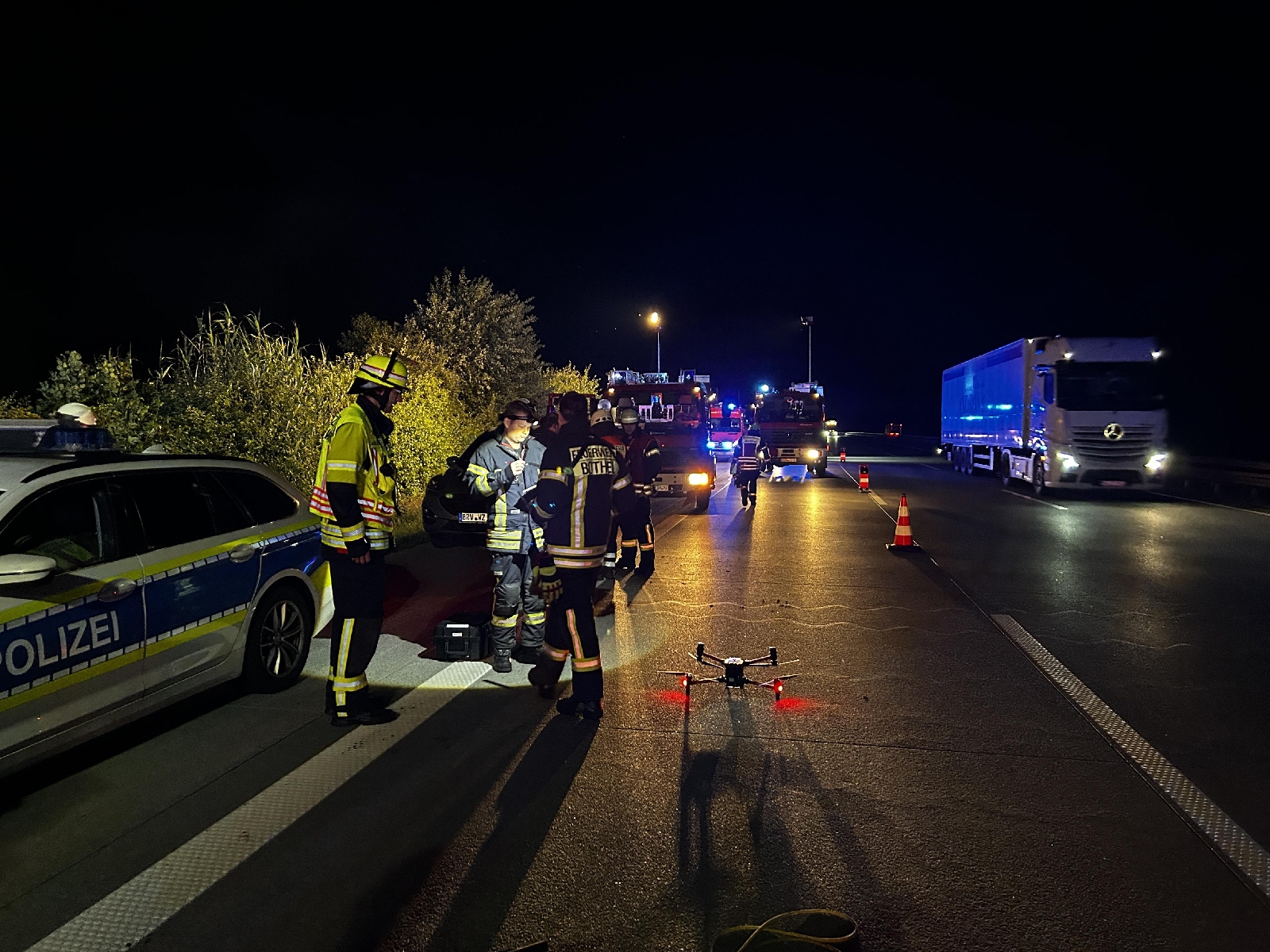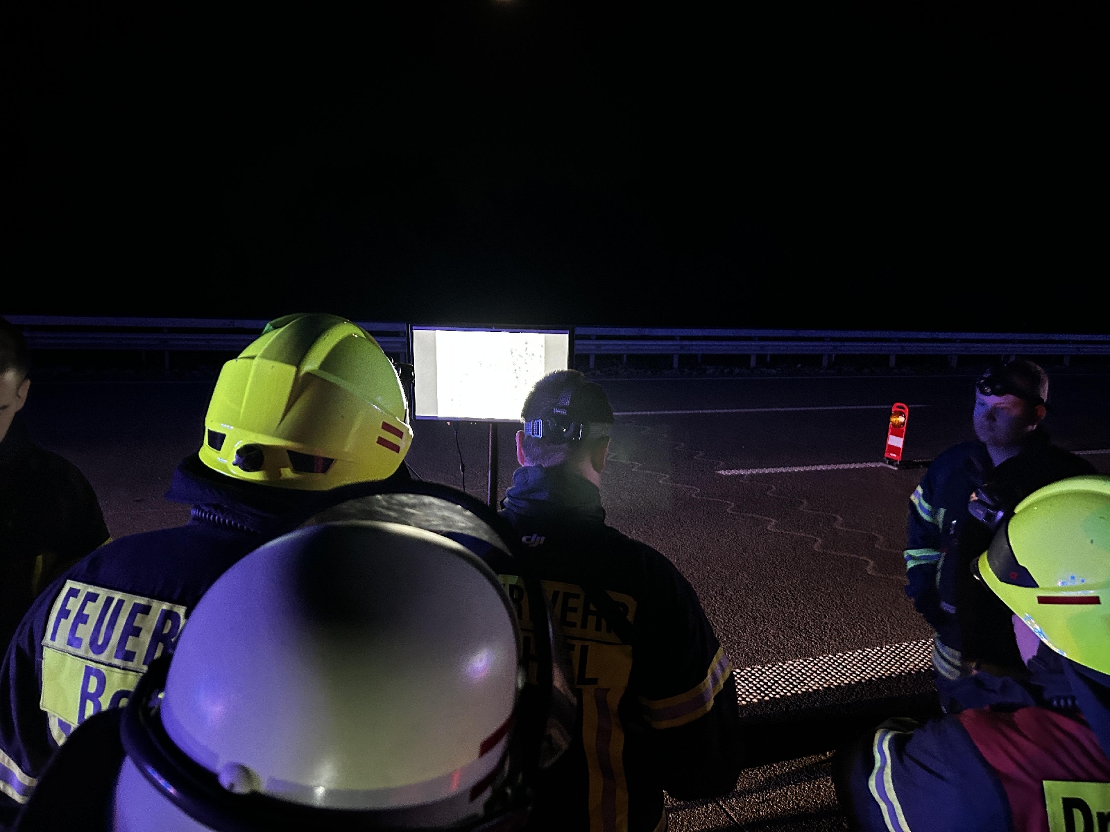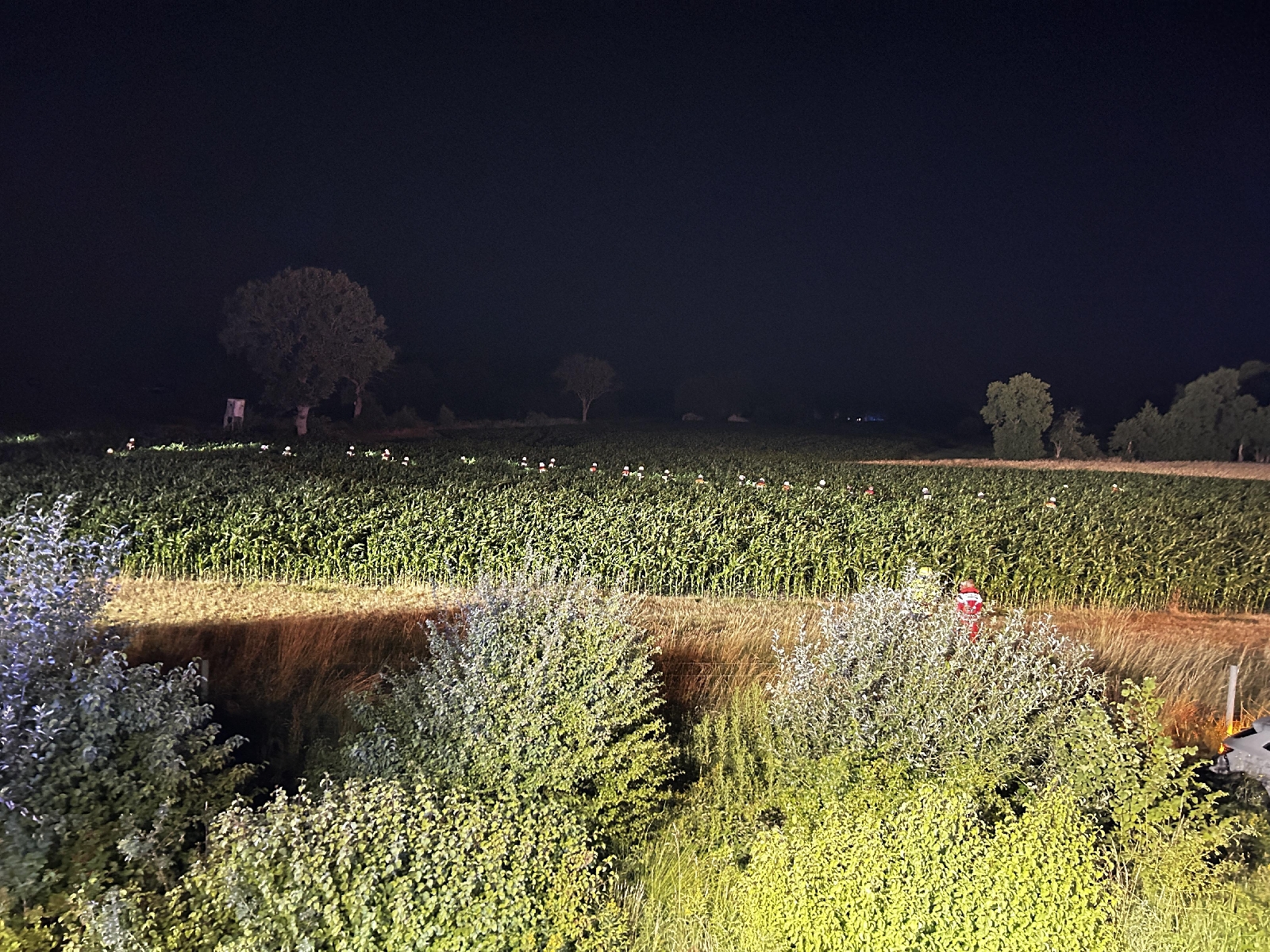 Das angrenzende Maisfeld wurde mittels einer Menschenkette durchsucht, da vermutet wurde, dass der Unfallfahrer sich aus dem Fahrzeug befreit hat und nun verwirrt herumirrt oder im Nahbereich liegt. Um schnell einen großen Bereich abdecken zu können wurde die Drohne der Feuerwehr Bothel nachalarmiert. Die Drohne konnte innerhalb von 25 Minuten einen Bereich von ca. 18 Hektar mittels einer Wärmebildkamera absuchen. Leider blieb die Suche mit der Menschenkette, sowie die Suche mittels Drohne erfolglos.