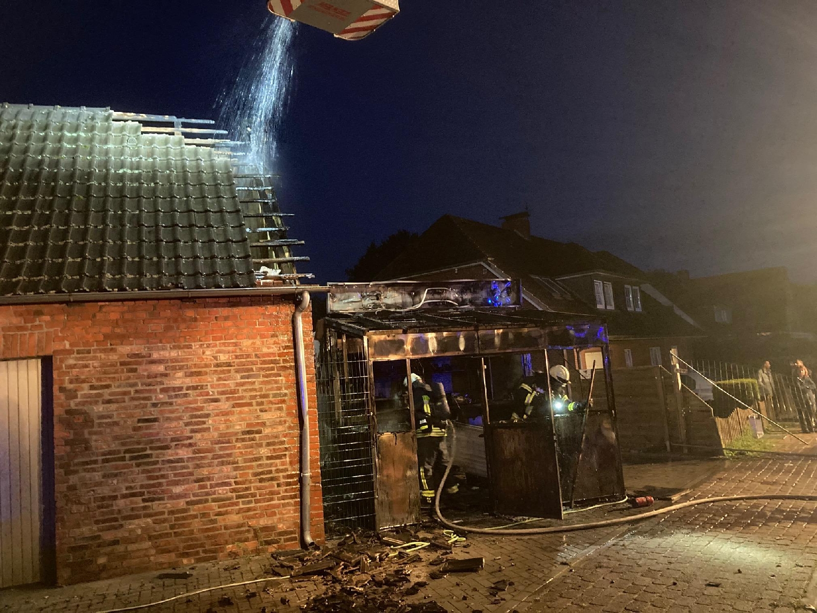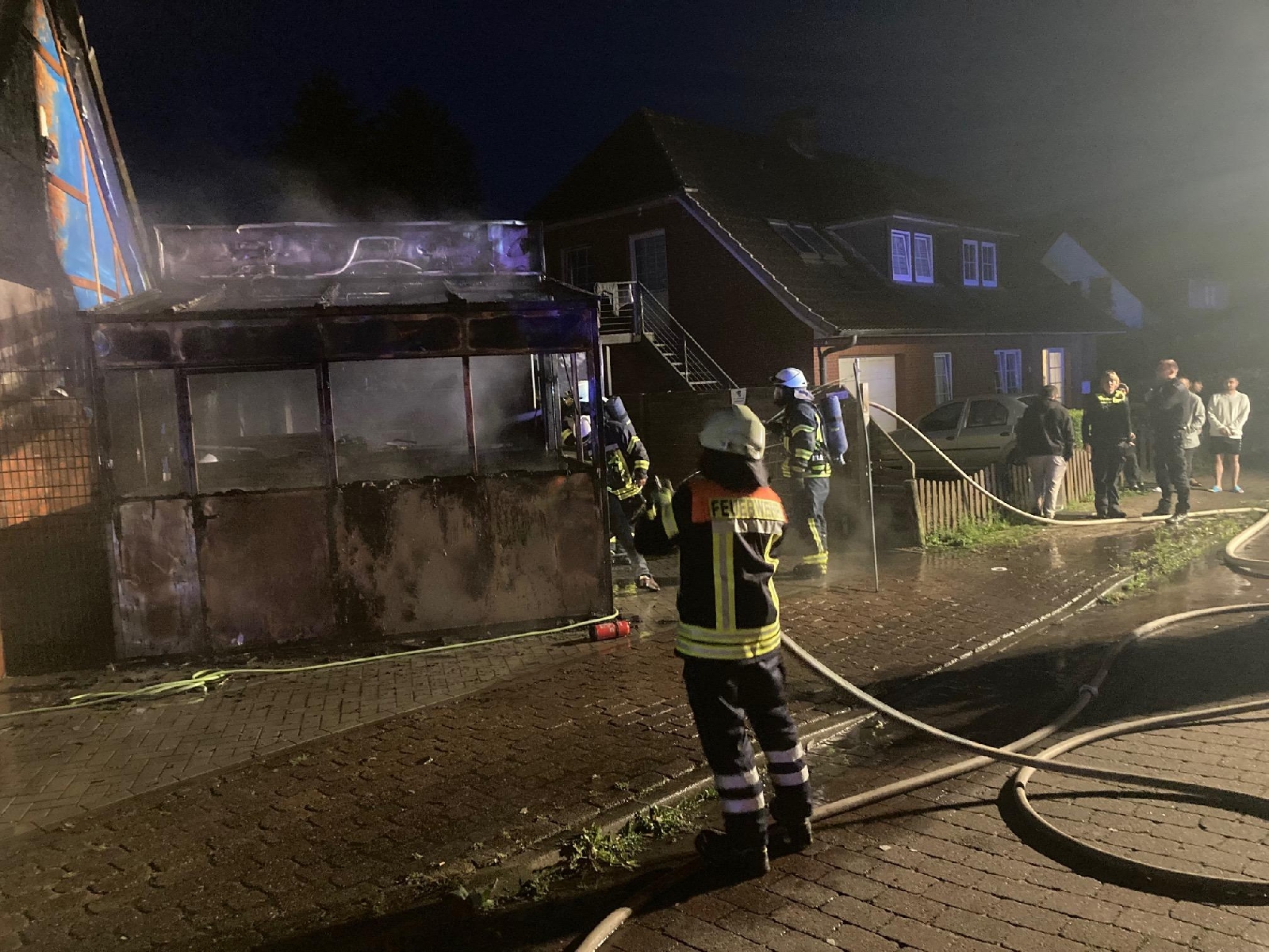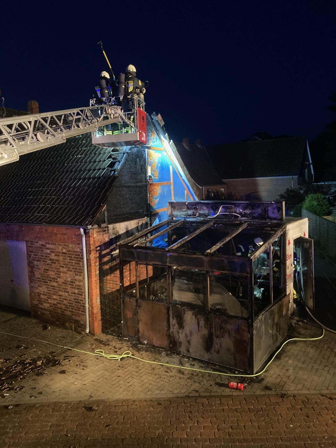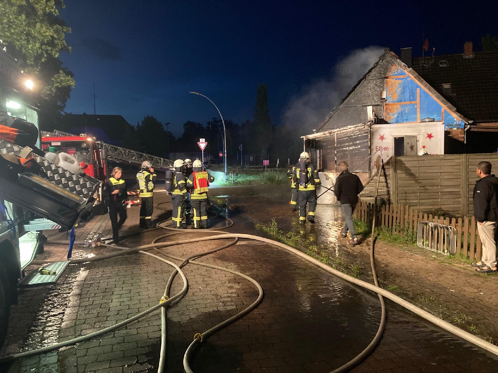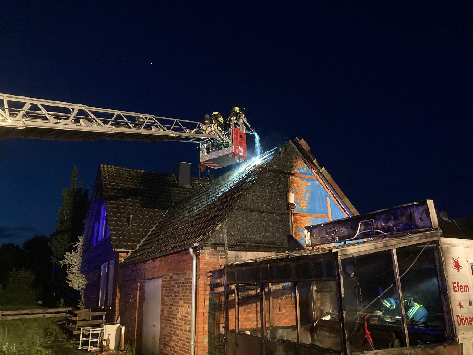Zeven(tw) Die Ortsfeuerwehr Zeven wurde am 25.07 um 03:50 Uhr zu einer unklaren Rauchentwicklung/Feuerschein Gebäude in der Straße Am Bahnhof alarmiert. Auf Anfahrt der ersten Kräfte gab es eine Änderung des Einsatzortes, in der Bahnhofstraße brannte ein Imbisswagen in voller Ausdehnung die Flammen hatten bereits Teile des angrenzenden Dachstuhl in Mitleidenschaft gezogen. Umgehend wurde die Brandbekämpfung mit zwei C Rohren sowie aus dem Korb der Drehleiter aufgenommen. Anwohner hatten vor Eintreffen der Feuerwehr bereits mittels Kartenschlauch eingeleitet. Durch die Einsatzkräfte wurde unteranderem eine Gasflasche geborgen. Das Feuer konnte durch die eingesetzten Kräfte schnell unter Kontrolle gebracht werden und ein Ausbreiten auf den kompletten Dachstuhl verhindert werden.