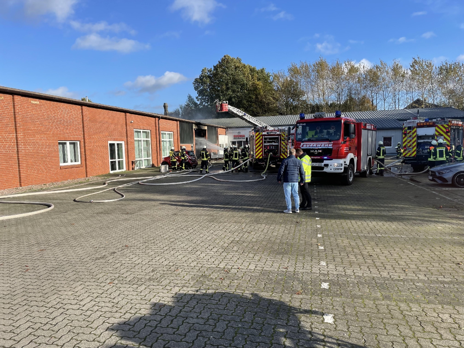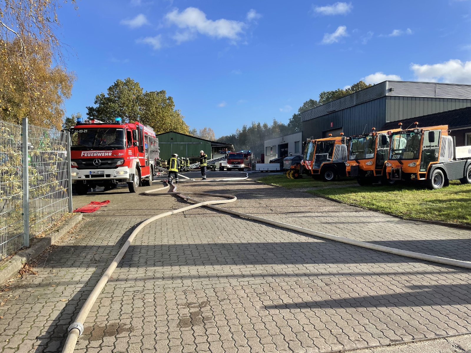 Bei Eintreffen der Feuerwehren drangen bereits Flammen aus dem Dachbereich. Umgehend wurde das Alarmstichwort zunächst auf Feuer 4 und später noch auf Feuer 5 erhöht. Anfangs gingen mehrere Trupps unter Atemschutz ins Gebäude, um den Brand zu bekämpfen. Der Innenangriff musste gleich wieder abgebrochen werden, da das Feuer aufgrund der Brandlast in dem Gebäude zu groß wurde. Zudem drohte die Halle einzustürzen. Mit mehreren C-Rohren und zwei Drehleitern musste eine massive Brandbekämpfung von außen durchgeführt werden. Zur Nachbarhalle wurde eine Riegelstellung aufgebaut. Diese wurde zum Glück von den Flammen verschont. Auch der Bürotrakt blieb von dem Feuer unberührt. Hier war lediglich Rauch eingedrungen. Um an die Glutnester heranzukommen, musste die Dachhaut aus der Drehleiter geöffnet werden. Gegen 11.40 Uhr war das Feuer so weit unter Kontrolle. Anschließend wurden aufwendige Nachlöscharbeiten im Bereich des Dachs durchgeführt. Verletzt wurde bei diesem Großeinsatz glücklicherweise niemand. Es wurden lediglich zwei betroffene Mitarbeiter vorsorglich untersucht.