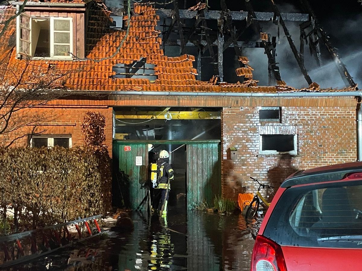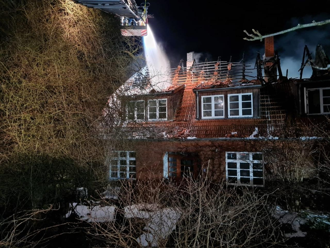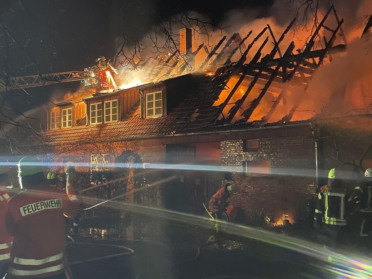 Gegen kurz nach 21 Uhr am Samstagabend geriet aus ungeklärter Ursache in Bülstedt in der Straße "Zum Bruch" ein Einfamilienhaus mit angrenzendem Stall in Brand. Das rund 25 mal 9 Meter große Gebäude stand bei Eintreffen der ersten Einsatzkräfte in Vollbrand. Der Brand war vom Stall aus auf das Wohngebäude übergegriffen.