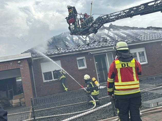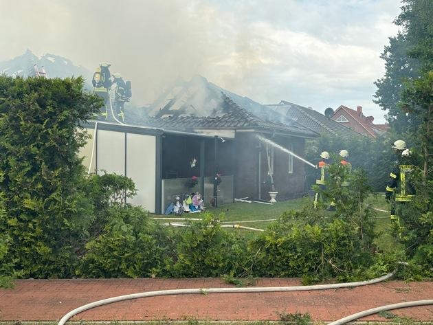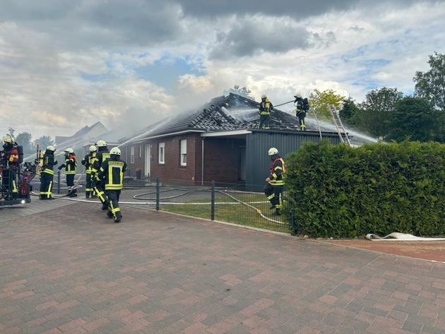 18.05.2024 Zeven (as). Gegen 14.10 Uhr am Samstagnachmittag geriet aus ungeklärter Ursache ein Einfamilienhaus in Zeven im Ibisweg in Brand. Bei Eintreffen der ersten Feuerwehren stand der Dachstuhl des Bungalows in Vollbrand. Umgehend musste das Alarmstichwort erhöht werden. Demnach wurden weitere Kräfte zur Einsatzstelle alarmiert.