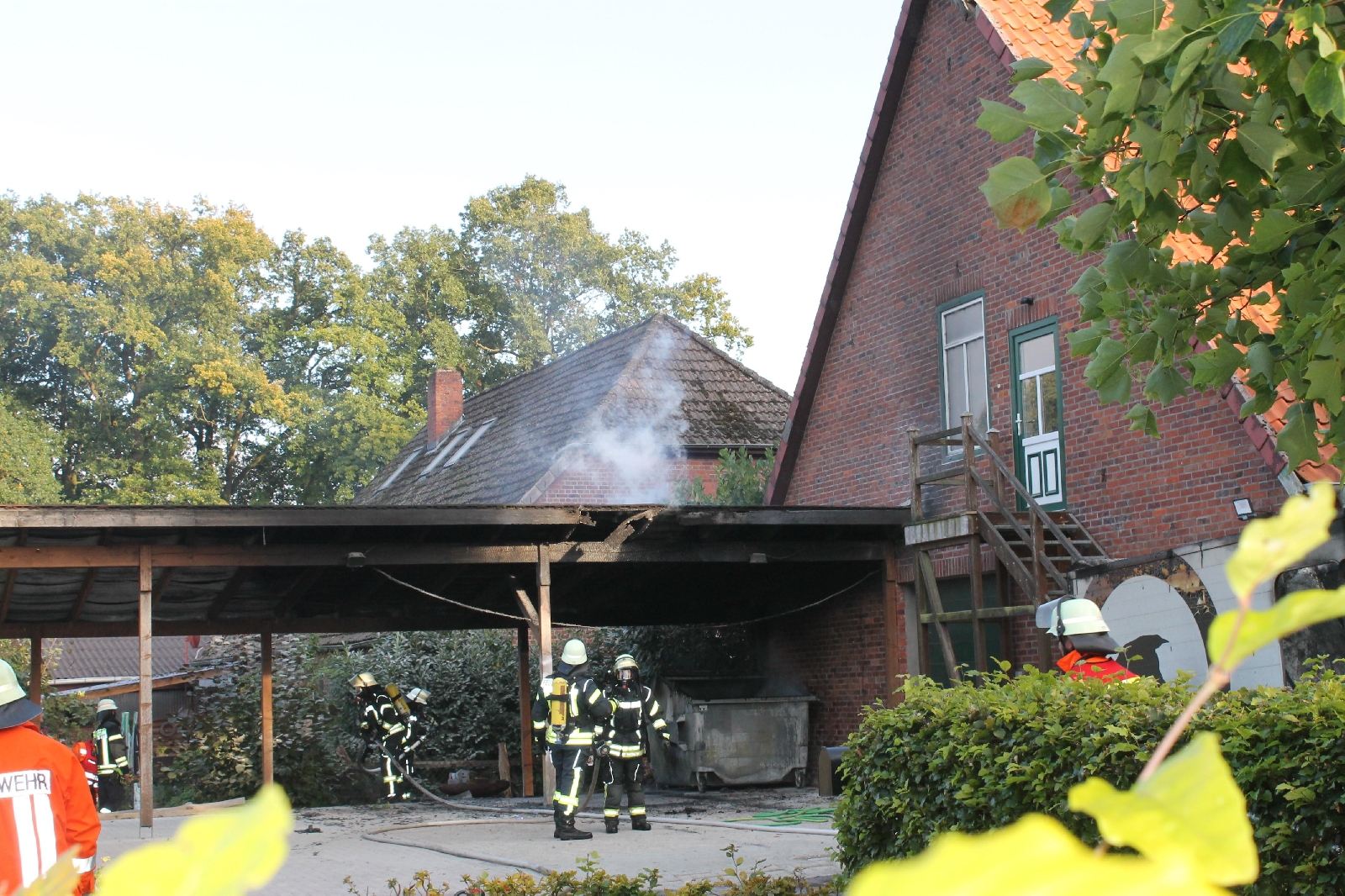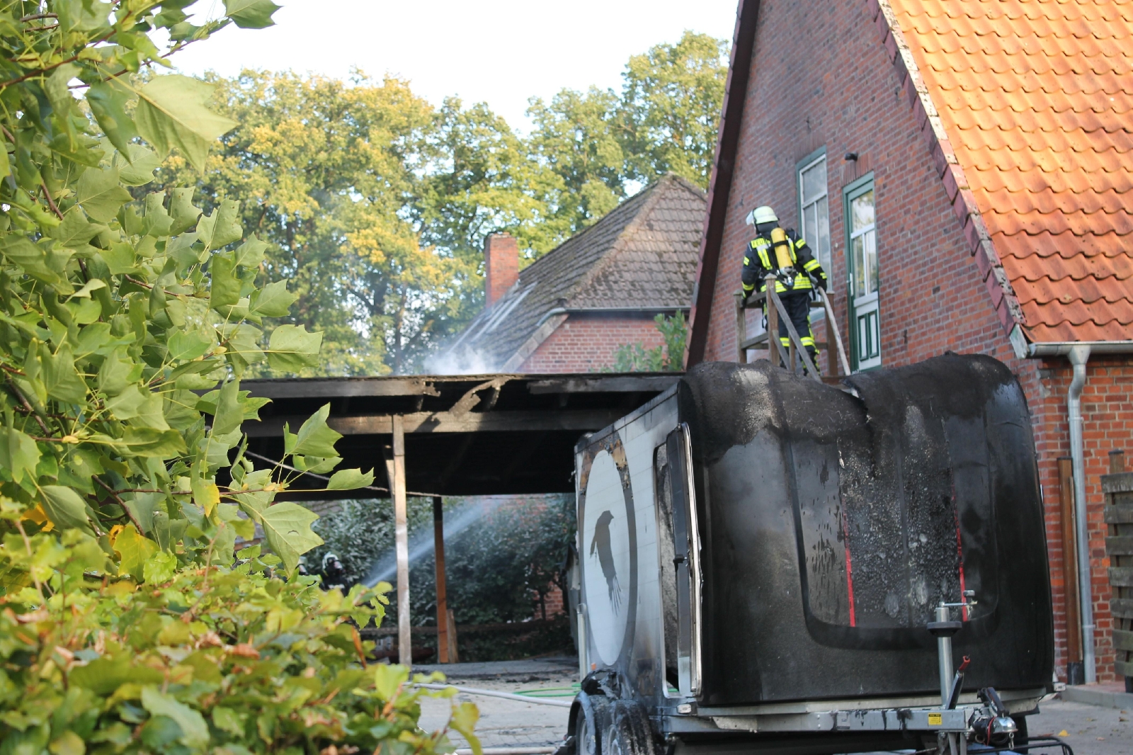 Granstedt. Am Montagnachmittag gegen 17 Uhr ging es erneut zu einem Feuer nach Granstedt in die dortigen Granstedter Dorfstraße, hier stand aus unerklärlichen Gründen ein Anhänger sowie Teile des Carports in Flammen, diese drohten auf das angrenzende Wohnhaus überzugreifen. Nachbarn und Anwohner hatten bereits erste Löschversuche mit Feuerlöschern vorgenommen und den Anhänger ins freie gezogen. Das Feuer war nach dem Beginn der Löschmaßnahmen schnell unter Kontrolle und kurze Zeit später auch gelöscht. Aufgrund des schnellen Handels konnte das Wohnhaus gerettet werden.