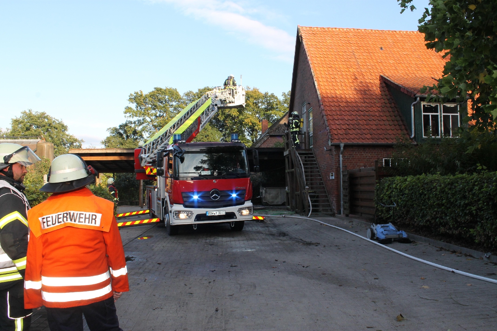 Die Drehleiter aus Zeven wurde in Stellung gebracht, um Teile des Daches einzureißen und mit der Wärmebildkamera nach weiteren Glutnestern zu schauen. Drei Personen wurden bei dem Einsatz verletzt und mit dem Rettungswagen in umliegende Krankenhäuser transportiert.