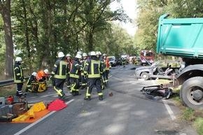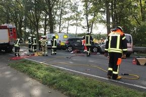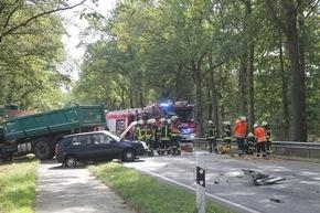Aus ungeklärter Ursache ist eine Kia-Fahrerin auf die Gegenfahrbahn geraten und mit einem entgegen kommenden Lkw zusammengestoßen. Dieser kam nach rechts von der Fahrbahn ab touchierte eine Leitplanke und prallte danach auf der linken Seite gegen einen Baum. Vorher kollidierte er noch mit einem VW Golf. Der Kia kollidierte zudem noch mit einem Kleintransporter und einem Opel.