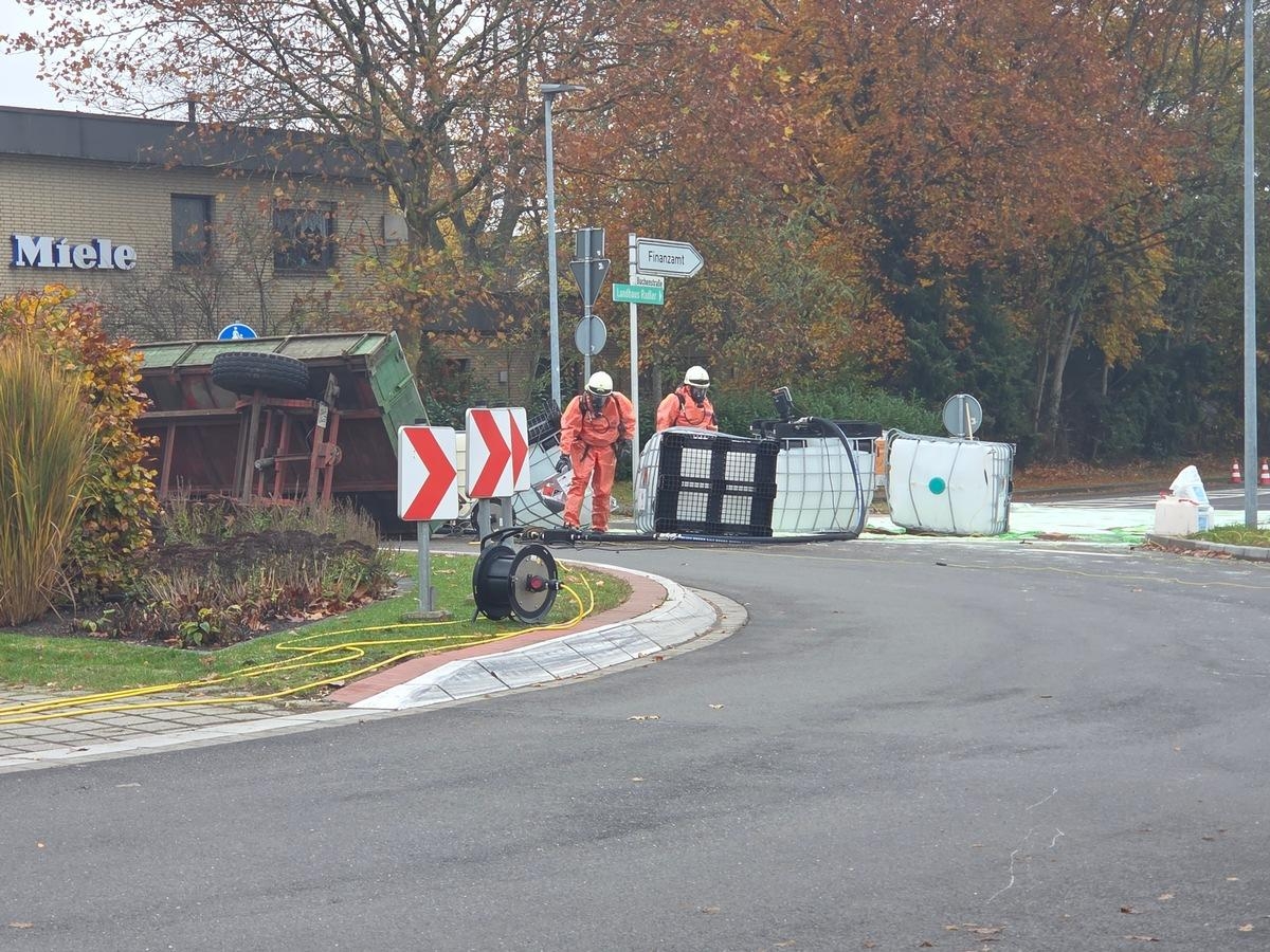 Beim Eintreffen der ersten Kräfte am Kreisel an der B71 lag ein Anhänger eines Taktors im Kreisverkehr auf der Seite. Der Anhänger war mit vier IBC-Containern beladen, die Propionsäure enthielten. Zwei der Behälter waren beschädigt, wodurch größere Mengen Flüssigkeit austraten. Der Fahrer hatte eigenständig versucht, das Ausbreiten der Säure zu verhindern, und zog sich dabei Verätzungen im Gesichtsbereich zu. Er wurde vom Rettungsdienst versorgt und anschließend in eine Klinik nach Bremen transportiert.
