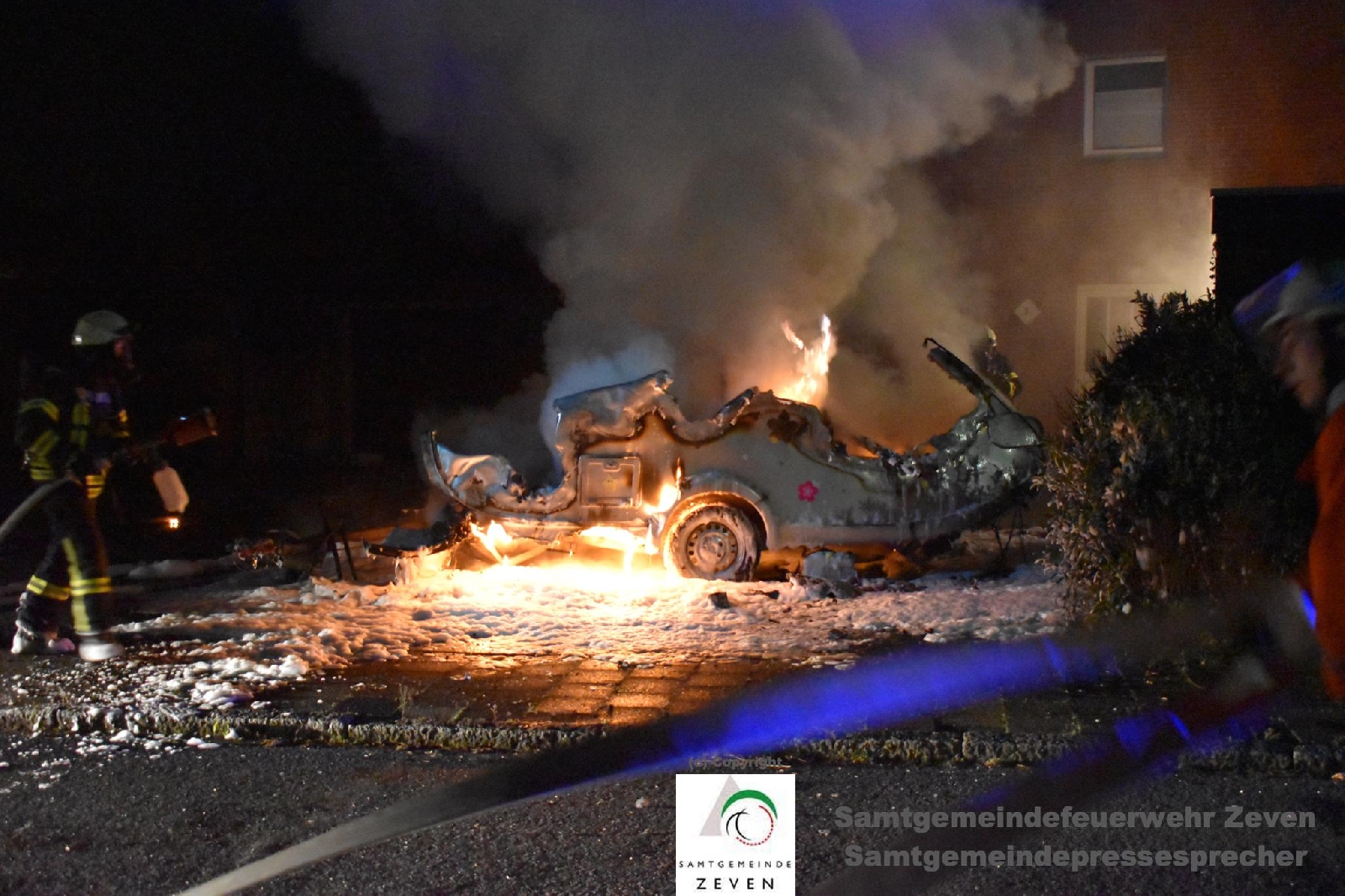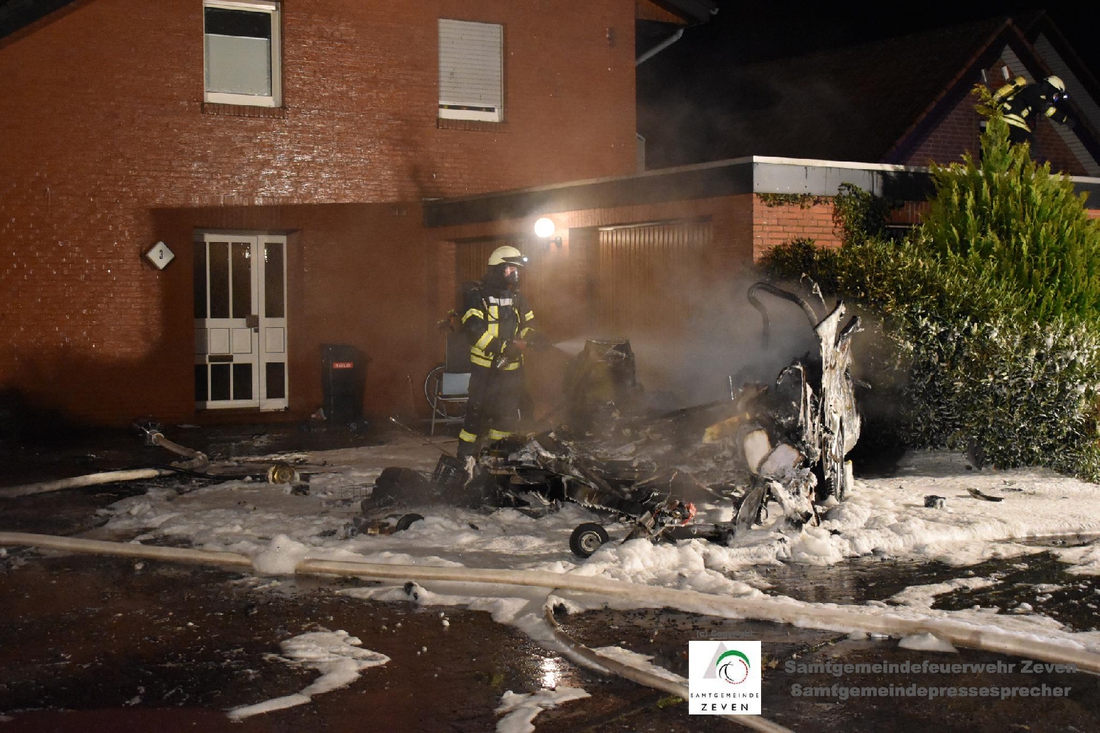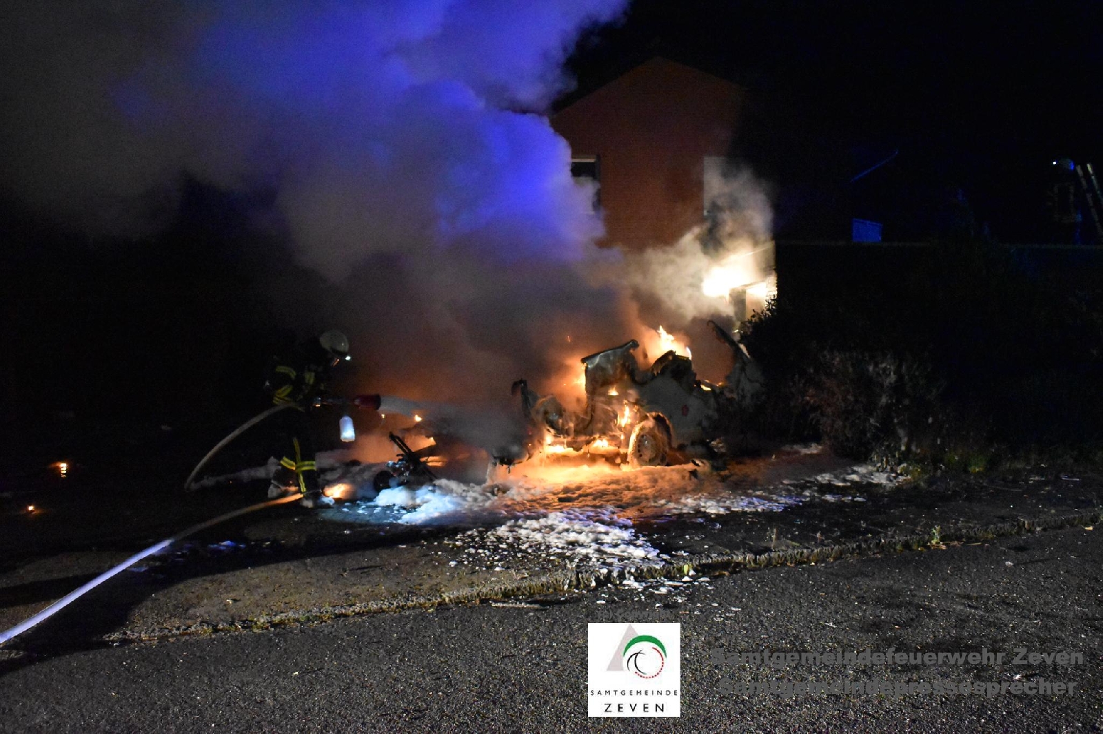 In der Nacht zum Sonntag wird ein Wohnwagen in Zeven komplett durch ein Feuer zerstört. Um 01:44 Uhr wird der Polizeiwache der Brand eines, vor einer Garagenzufahrt stehenden, Wohnanhängers gemeldet. Bei Eintreffen der Einsatzkräfte der Feuerwehr Zeven und Polizei brennt der Anhänger in voller Ausdehnung. Zwei Anwohner atmen bei Löschversuchen Rauschgase ein und werden verletzt ins Krankenhaus eingeliefert. Eine im Wohnwagen gelagerte Gasflasche explodierte vor dem Eintreffen der Hilfskräfte; umherfliegende Trümmerteile beschädigten zwei angrenzende Gebäude leicht. Am Brandort waren Einsatzkräfte der Feuerwehren Zeven und Heeslingen eingesetzt. Die Ursache des Feuers ist bislang nicht geklärt; noch in der Nacht haben die Brandermittler der Polizei mit der Ursachenforschung begonnen. Der Gesamtschaden wird auf etwa 40.000EUR geschätzt.