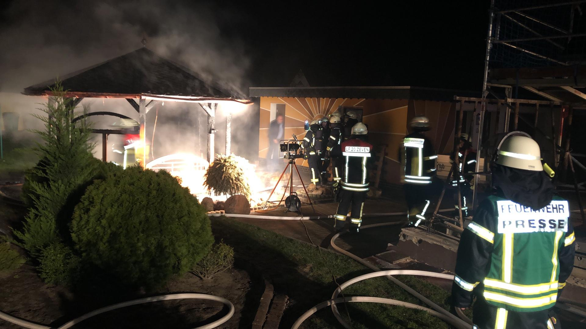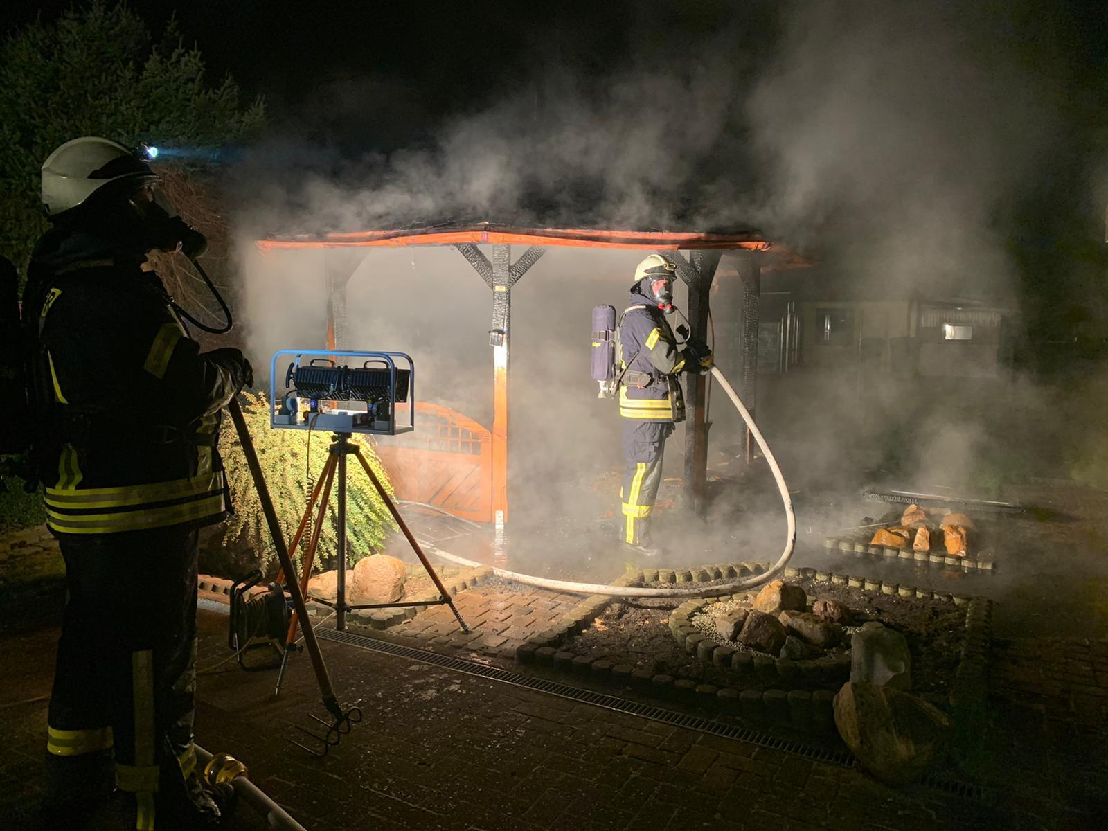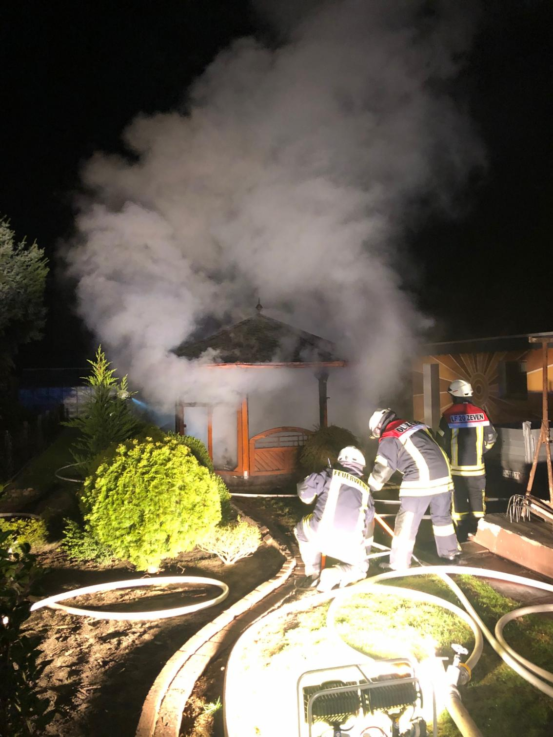 Zeven (tg). Um 0:29 Uhr wurde die Ortsfeuerwehr Zeven zu einem brennenden Carport in die Jahnstraße nach Zeven alarmiert. Laut ersten Meldungen sollte dort ein Carport in voller Ausdehnung brennen. Dieses konnte von den ersteintreffenden Feuerwehrleuten nicht bestätigt werden. Es brannte ein ca. 4,5 x 4,5m Gartenpavillon aus Holz, welcher in unmittelbarer Nähe zur Garage stand. Durch die sofort eingeleiteten Löschmaßnahmen konnte ein übergreifen der Flammen auf die Garage verhindert werden. Der Pavillon wurde abgelöscht und anschließend mit der Wärembildkamera auf weitere Glutnester überprüft. Nach gut einer Stunde war der Einsatz für die 20 Einsatzkräfte, die mit vier Fahrzeugen vor Ort waren, beendet.