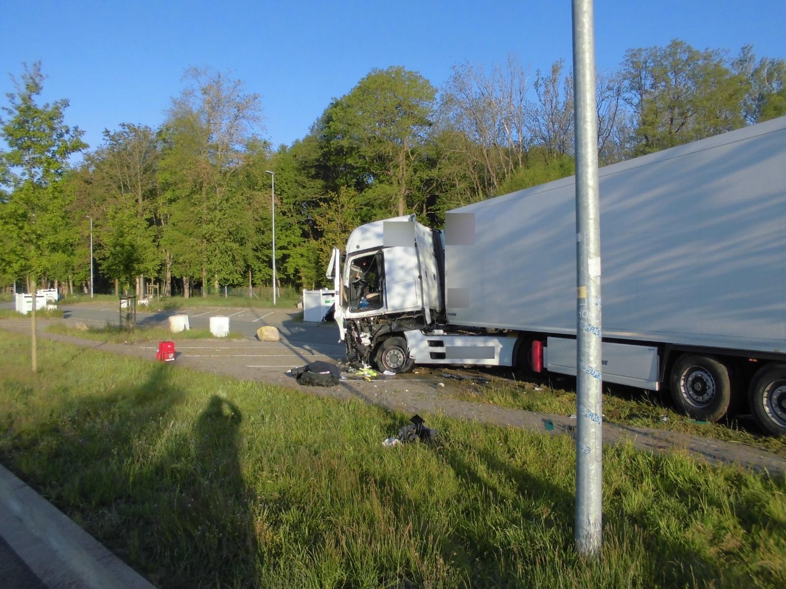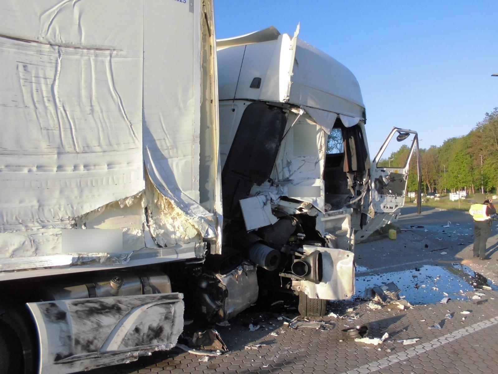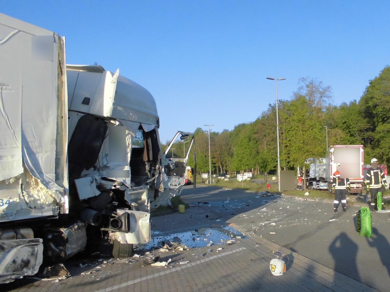 Die beteiligten Sattelzugmaschinen wurden durch das Unfallgeschehen massiv beschädigt, daher beziffert die Polizei den entstandenen Sachschaden mit etwa 130.000 Euro.