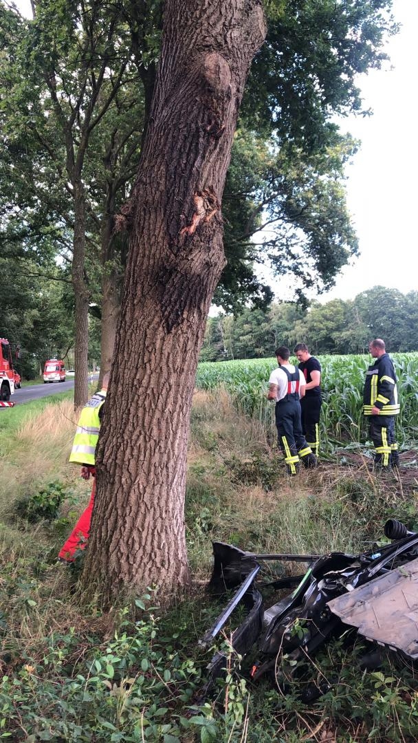 Verkehrsunfall mit einer eingeklemmten Person auf der L 132 zwischen Hemel und Steinfeld am 17.07.2020. Die Feuerwehren aus Zeven und Brüttendorf haben die Person aus dem Farzeug geborgen.