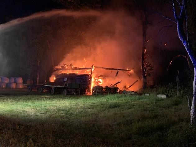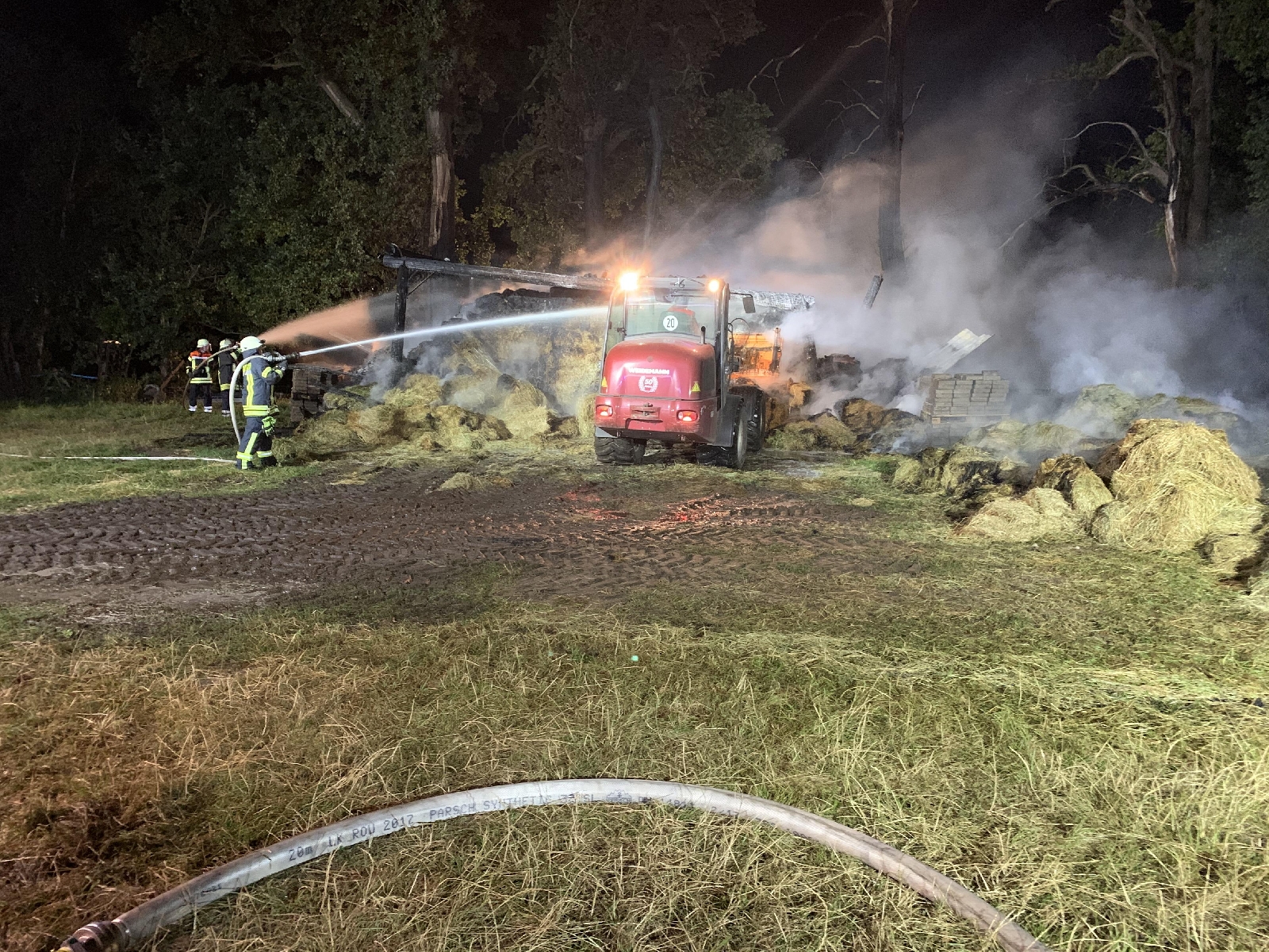 Mit dem Alarmstichwort "F3 brennt landwirtschaftliches Gebäude" wurden um 0:36 Uhr die Feuerwehren Boitzen, Steddorf, Wense, Heeslingen, Sassenholz und Zeven an die L124 zwischen Boitzen und Steddorf alarmiert. Vor Ort fanden die Einsatzkräfte eine brennende Heumiete in einem ca. 15x15m großen Unterstand vor. Größere Bäume im Umfeld des Gebäudes hatten auch schon Feuer gefangen. Umgehend wurde mit der Brandbekämpfung begonnen und parallel dazu eine Wasserversorgung von einem naheliegenden Hydranten aufgebaut. Nach gut einer Stunde war das Feuer soweit unter Kontrolle, dass man beginnen konnte, dass Heu mit einem Radlader auseinander zu fahren, um es besser ablöschen zu können. Mit mehreren Strahlrohren wurde das auseinander gefahren Heu dann abgelöscht. Landwirte aus den Boitzen und Steddorf unterstützten die Löscharbeiten mit zwei Güllerfässern voll Wasser. Die Löscharbeiten zogen sich noch bis zum frühen Morgen hin.
