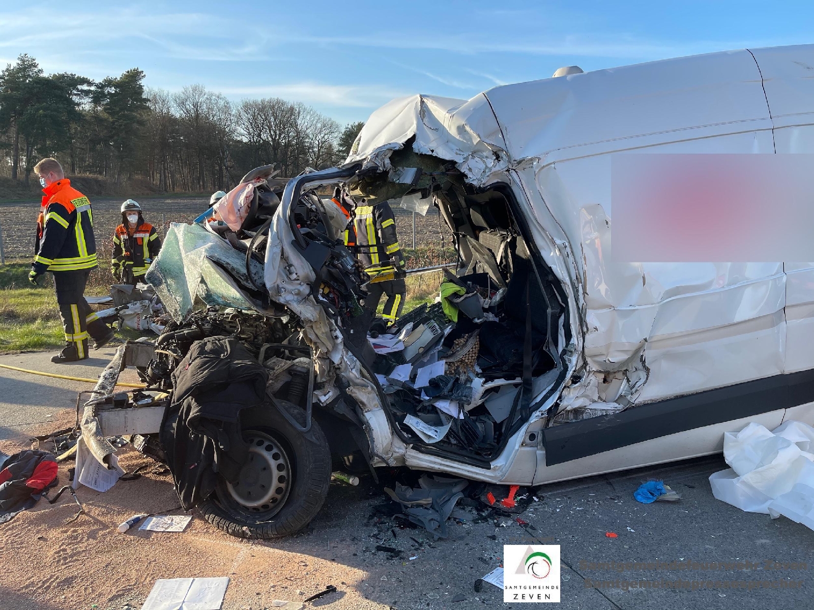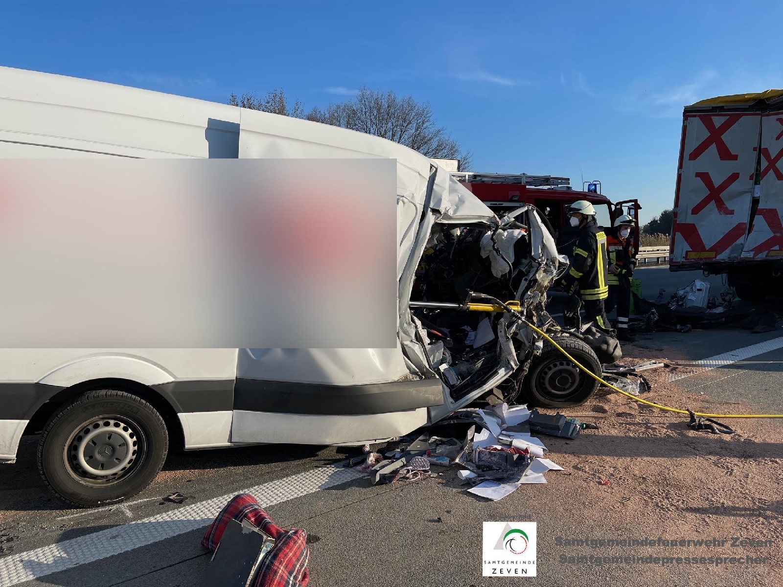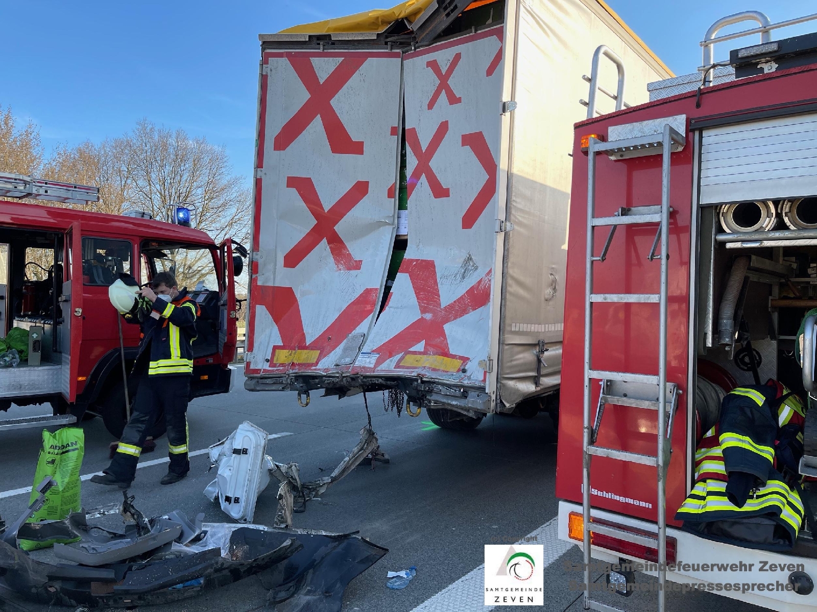 Den erst eintreffenden Kräften stellte sich folgende Lage dar. Ein Mercedes Sprinter war aus noch unbekannter Ursache ungebremst unter einem vor ihm stehenden Sattelauflieger gefahren und durch die Wucht des Aufpralles unter dem Auflieger stecken geblieben. Dabei wurde die Front des Sprinters massiv eingestaucht. Da durch die Wucht des Aufpralls und des Ausmaßes der Zerstörung keine Hoffnung mehr für den Fahrer des Fahrzeuges bestand, wurde zu erst mit der Bergung des Fahrzeuges unter dem Auflieger begonnen. Unter zur Hilfenahme der Winde des Zevener Rüstwagens wurde das Fahrzeug herausgezogen. Anschließend wurde mit zwei Rettungssätzen und diversen hydraulischen Stempeln die Fahrerkabine des Sprinters soweit geöffnet, dass man an den Fahrer heran kam und die Beifahrerseite auf eine mögliche zweite Person kontrollieren konnte. Da sich in dem Fahrzeug nur eine Person befand, konnten diese Arbeiten dann zügig abgeschlossen werden. Nach eintreffen des Bestattungsunternehmens unterstützte die Feuerwehr noch bei der Bergung der Leiche. Die an der Einsatzstelle ausgelaufenen Betriebsstoffe wurden großflächig mit Bindemittel abgestreut. Erste Kräfte konnten dann aus dem Einsatz entlassen werden und an ihre Standorte zurückkehren. Die letzten Einsatzkräfte verliessen nach gut 2 Stunden die Einsatzstelle.
