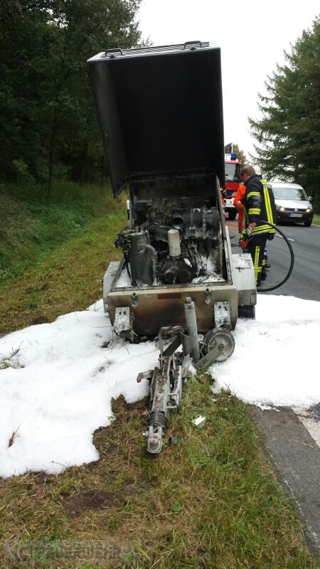 Brüttendorf(tw) Die Ortsfeuerwehren aus Zeven und Brüttendorf wurden am 04.10.13 um 11:11 Uhr von der Rettungsleitstelle in Zeven mit dem Einsatzstichwort FK2 brennt Anhänger auf der B71 zwischen Brüttendorf und Wehldorf alarmiert. Nach Eintreffen der ersten Kräfte konnte festgestellt werden,dass eine Estrichpumpe aus noch ungeklärter Ursache in brand geraten ist. Das Feuer muste schon etwas länger unter der Motorhaube der angehängten Estrichpumpe gebrannt haben,dabei ist auch der Kraftstofftank der Estrichpumpe geschmolzen.Durch den leckgeschlagenen Tank ist eine Dieselspur von Zeven bis zur Schadensstelle entstanden,eine Spezialfirma wurde mit der Beseitigung der Dieselspur beauftragt. Das Feuer an dem Anhänger konnte mit Löschschaum schnell bekämpft werden.
