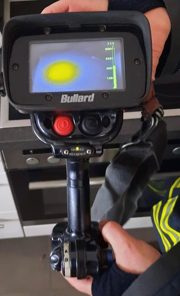 Foto: mit der Wärmebildkamera lassen sich schnell Hitzequellen erkennen und messen. In verqualmten Gebäuden lassen sich so beispielsweise Personen sehr schnell ausfindig machen.
