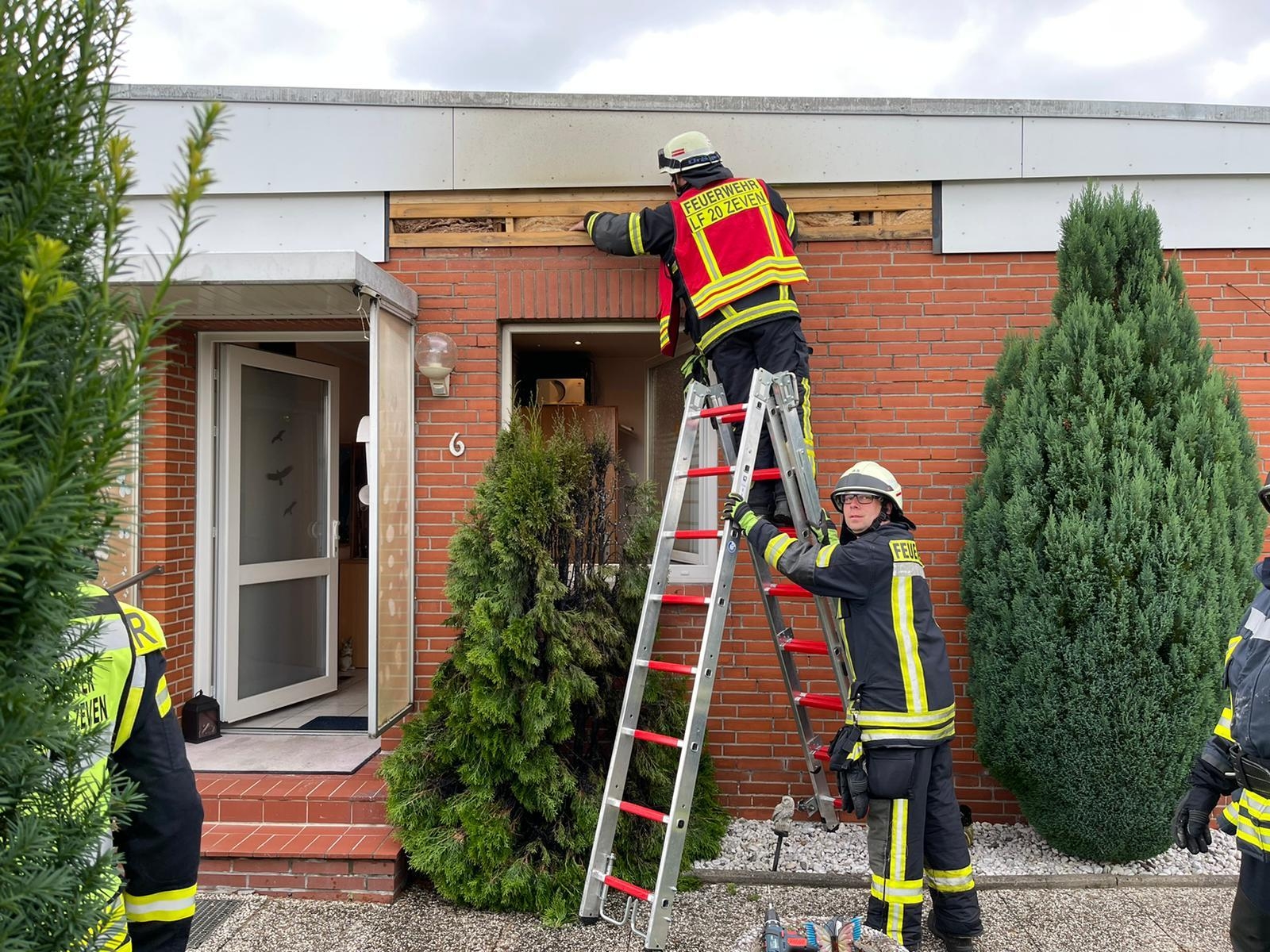 Vor Ort stelle sich folgende Lage dar: Beim vernichten von Unkraut mit einem Gasbrenner geriet eine nahe stehende Konifere in Brand. Durch die Trockenheit der letzten Tage ging diese gleich in Flammen auf und die Flammen schlugen dann bis zur Dachverkleidung hoch und sengten diese an. Die Besatzung des LF20 nahm die Multifunktionsleiter vor und demontierte die Dachverkleidung um den Bereich mit der Wärmebildkamera zu kontrollieren. Da in diesem Bereich keine erhöhte Temperatur festgestellt werden konnte, wurden die Platten wieder montiert. Die in Bereitstellung stehende Drehleiter konnte zwischenzeitlich wieder zum Standort zurückkehren.