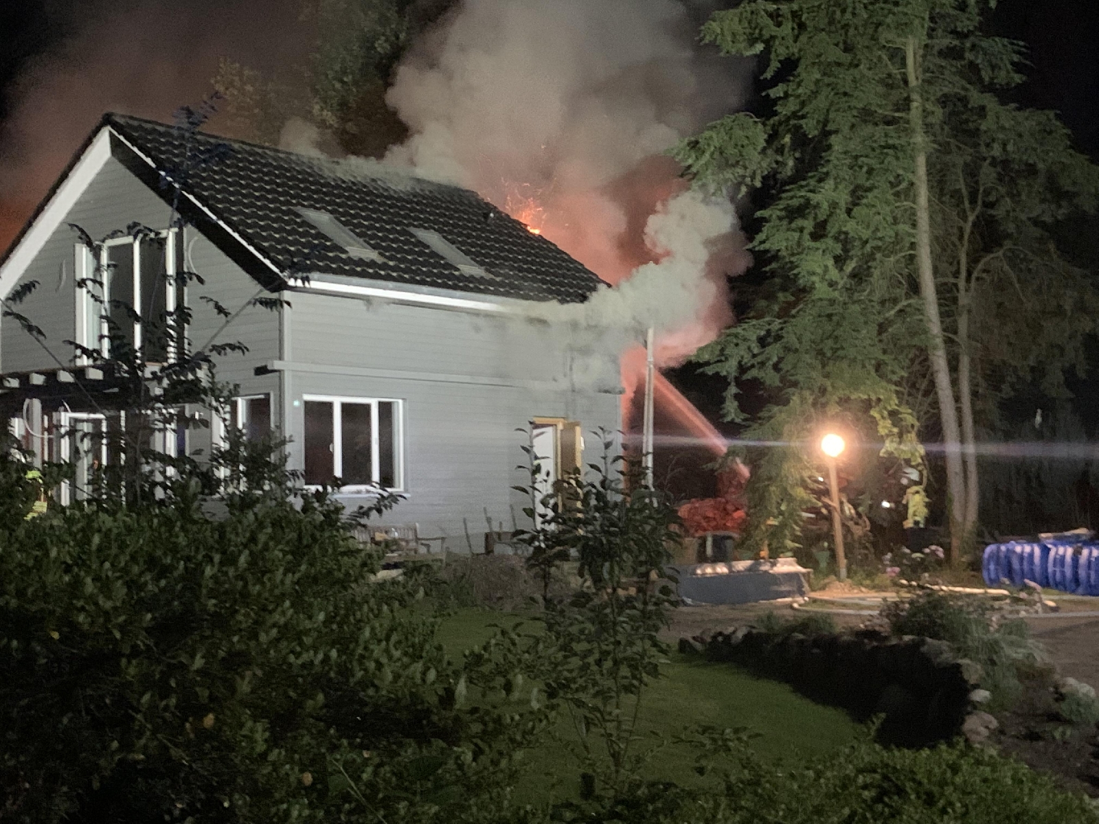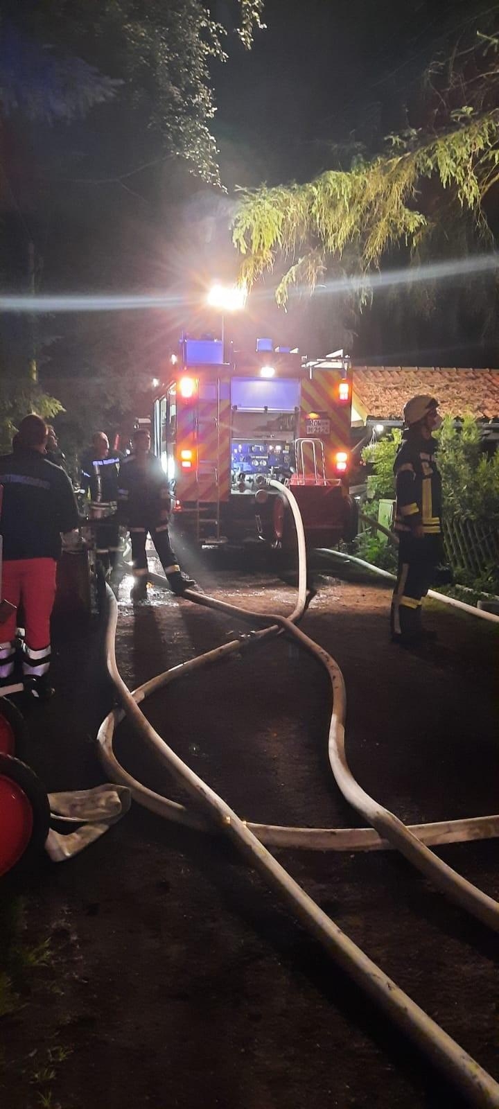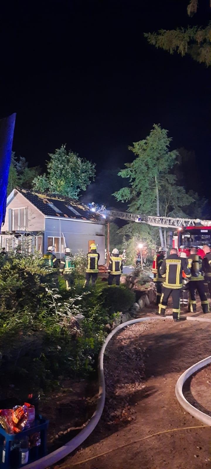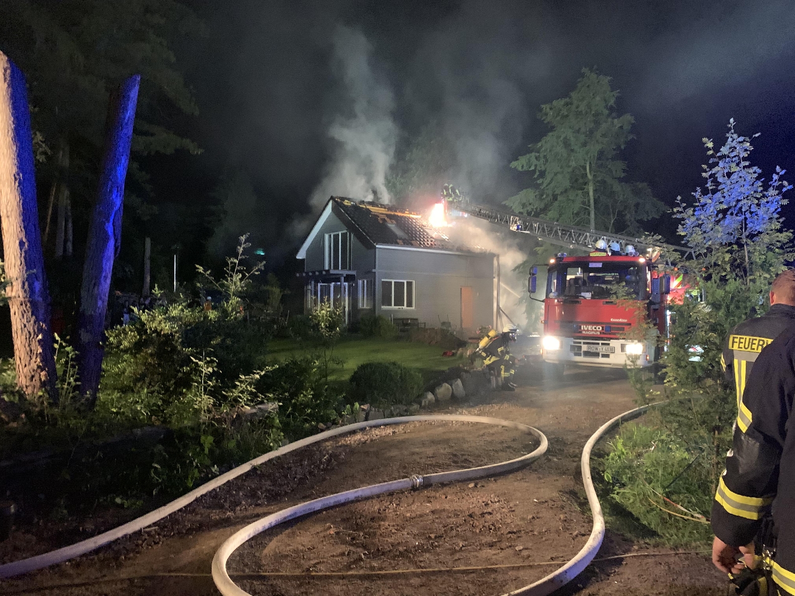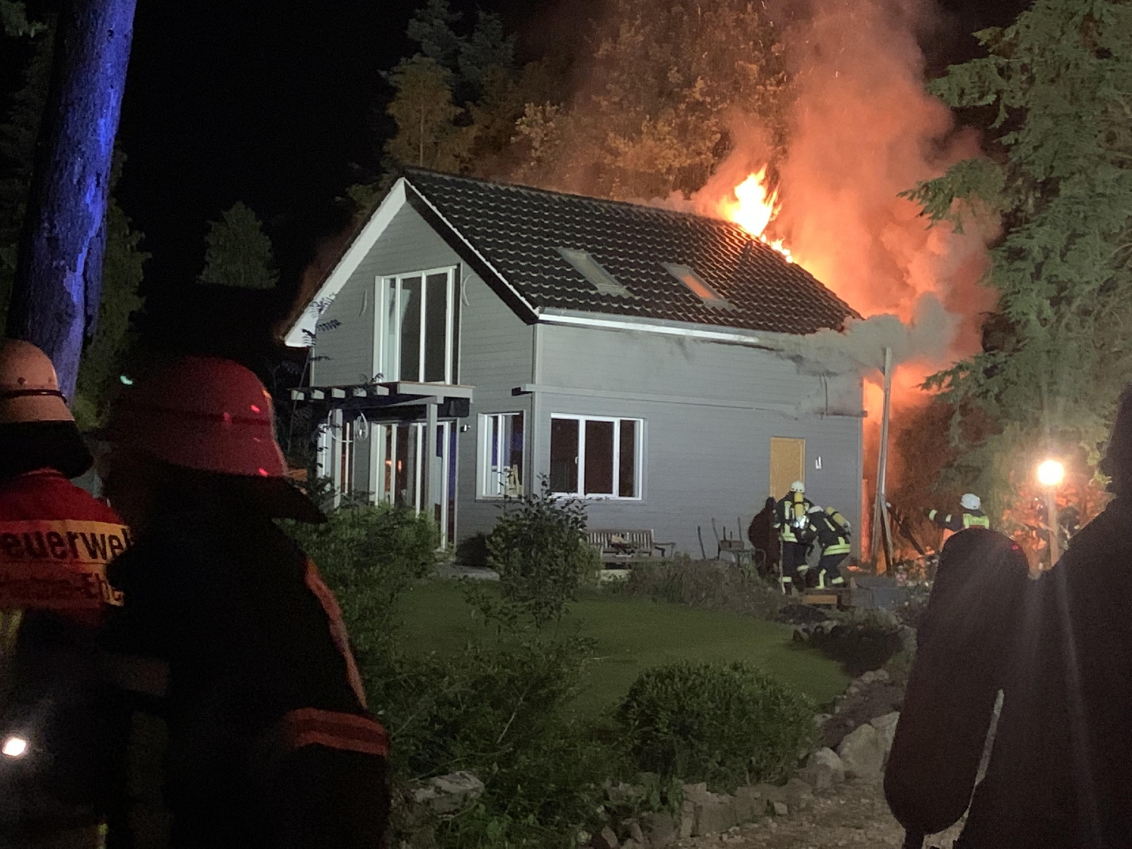 In der heutigen Nacht gegen 0:40 Uhr wurde der Feuerwehr ein Feuer in einem Holzhaus in der "Waldsiedlung" in Hatzte gemeldet. Umgehend wurden von der Leitstelle in Zeven die Feuerwehren Hatzte-Ehestorf und Elsdorf zur Einsatzstelle alarmiert. Schon auf der Anfahrt zur Einsatzstelle das Einsatzstichwort erhöht und die Drehleiter aus Zeven und die Feuerwehren Volkensen-Rüspel-Nindorf und Hamersen hinzualamiert. Vor Ort fanden die Einsatzkräfte einen Brand in der Holzfassade eines großen Holzwohnhaus vor, der sich schon bis in den Dachstuhl ausgebreitet hatte. Mit mehreren Trupps unter Atemschutz wurde von mehreren Seiten die Brandbekämpfung aufgenommen und die Fassade geöffnet. Parallel dazu wurde das Gebäude von Innen auf eine Brandausbreitung kontrolliert, dort jedoch kein Feuer gefunden. Zur Brandbekämpfung am Dach wurde die Drehleiter in Stellung gebracht und das Dach im Brandbereich geöffnet und die Flammen dort bekämpft. Da in den vom Feuer betroffenen Bereichen nicht nur die Fassade geöffnet, sondern auch die Dämmung entfernt musste, haben sich die Löscharbeiten eine Zeit lang hingezogen. Fortlaufend wurden die Bereiche mit Wärmebildkameras kontrolliert, um weitere Glutnester zum ablöschen ausfindig zu machen. Zum Teil mussten für die Nachlöscharbeiten Teile der Fassade mit Motorsägen geöffnet werden, um besser an die Glutnester ran zu kommen. Diese Arbeiten zogen sich dann bis ca. halb Vier am Morgen hin. Die Ortsfeuerwehr Hatzte-Ehestorf blieb mit einer Brandwache bis ca. 8:00 Uhr vor Ort.