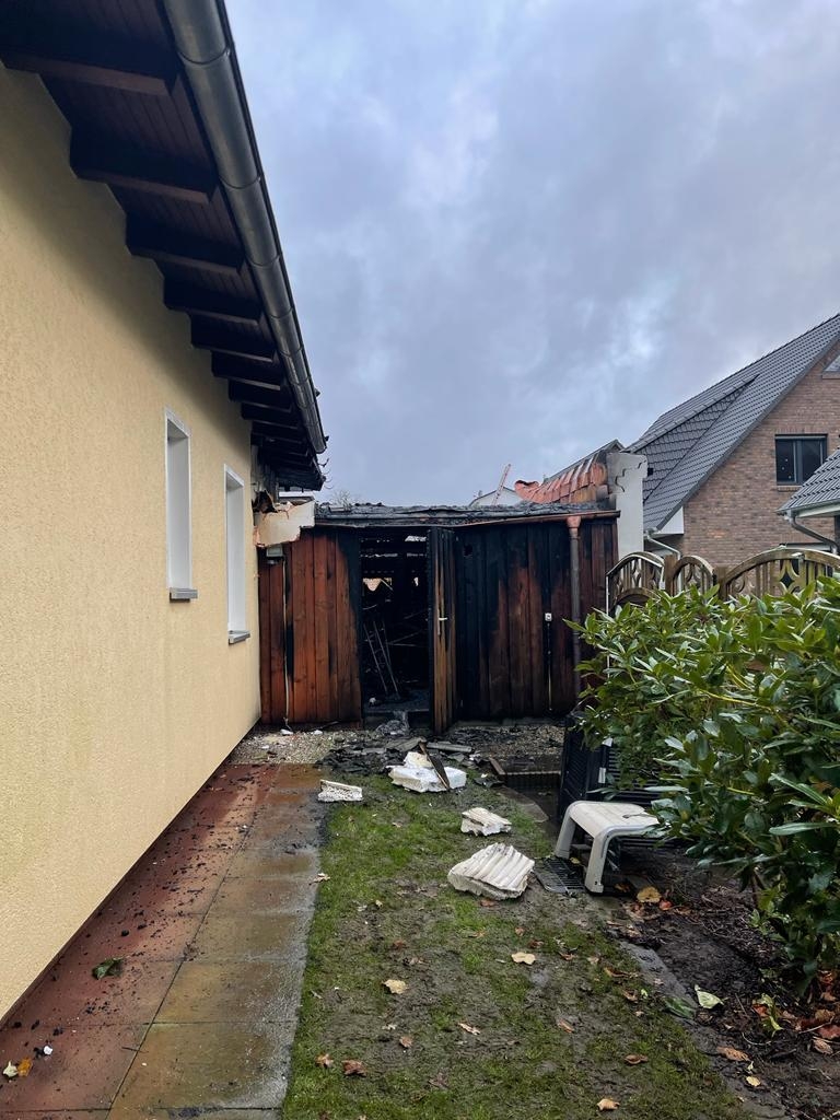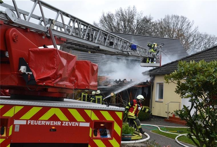 Zeven(tw) Die Ortsfeuerwehr Zeven wurde heute morgen um 10:21 Uhr gemeinsam mit der FF Brauel zu einem brennenden Carport im Zevener Stuhmer Weg alarmiert. Bei Eintreffen des Einsatzleiters stand der Geräteschuppen in Vollbarnd und hatte bereits auf das Wohnhaus übergegriffen. Umgehend wurde das Alarmstichwort auf F3 erhöht und die Feuerwehren aus Heeslingen und Brüttendorf nachgefordert. Mit mehreren C Rohren und mit Unterstützung der Drehleiter konnte das Wohnhaus gehalten werden. Teile des Daches wurden geöffnet und mit der Wärmebildkamera kontrolliert. An dem hözernen Anbau entstand Totalschaden. Die Einsatzkräfte wurden durch die Besitzer für ihr umsichtiges und schnelles Handeln gelobt.