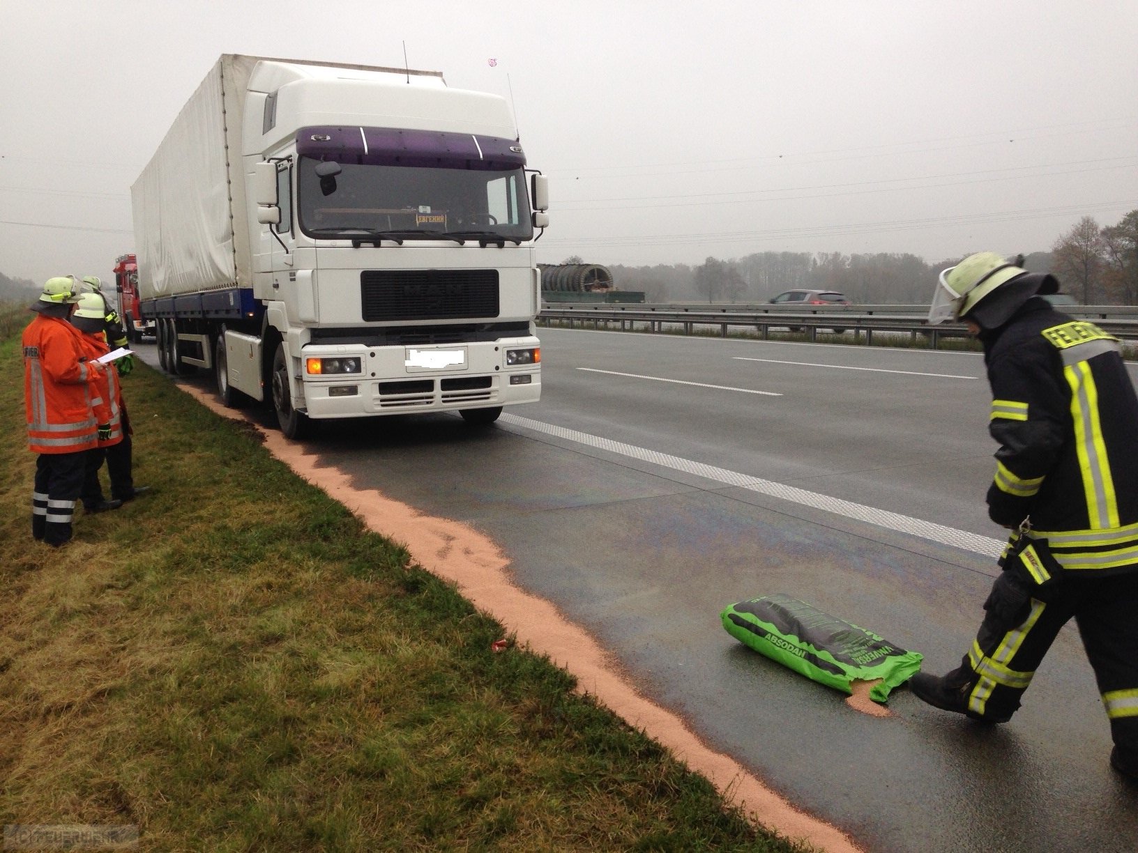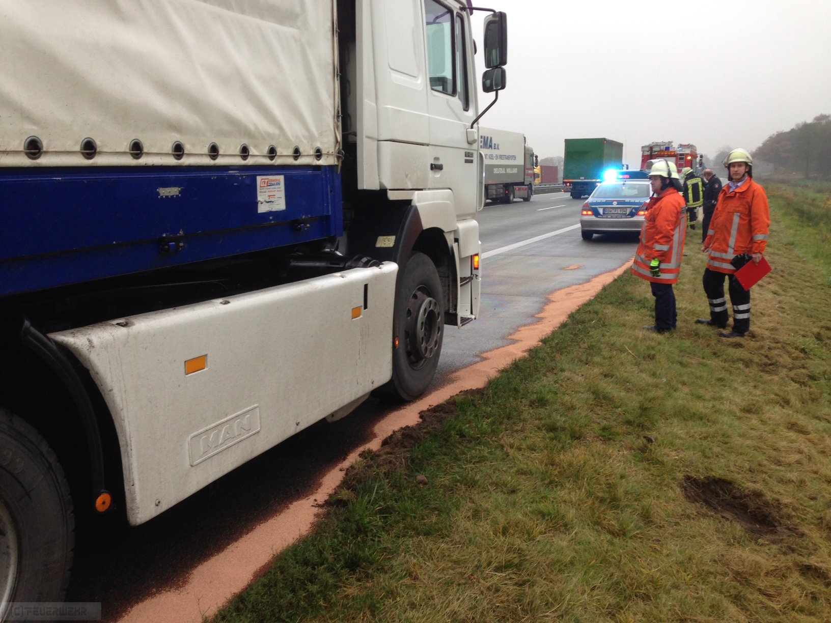Bockel(tw) Die Ortsfeuerwehren aus Gyhum und Zeven wurden am 19.11.13 um 14:10 Uhr von der Rettungsleitstelle in Zeven zu einer technischen Hilfeleistung auf die BAB HH>HB KM 75,3 alarmiert. Aufgrund eines technischen defektes an der Kraftstoffleitung eines LKW ist Dieselkraftstoff auf den Standstreifen neben der Autobahn gelaufen. Bei Eintreffen der Einsatzkräfte hatte der Fahrer des LKW den defekt bereits selber repariert,sodass kein Kraftstoff mehr auslaufen konnte. Es wurde noch etwas Bindemittel aufgebracht,damit nicht noch das Erdreich kontaminiert wird. Die Reinigung des Standstreifens hat eine Fachfirma übernommen.