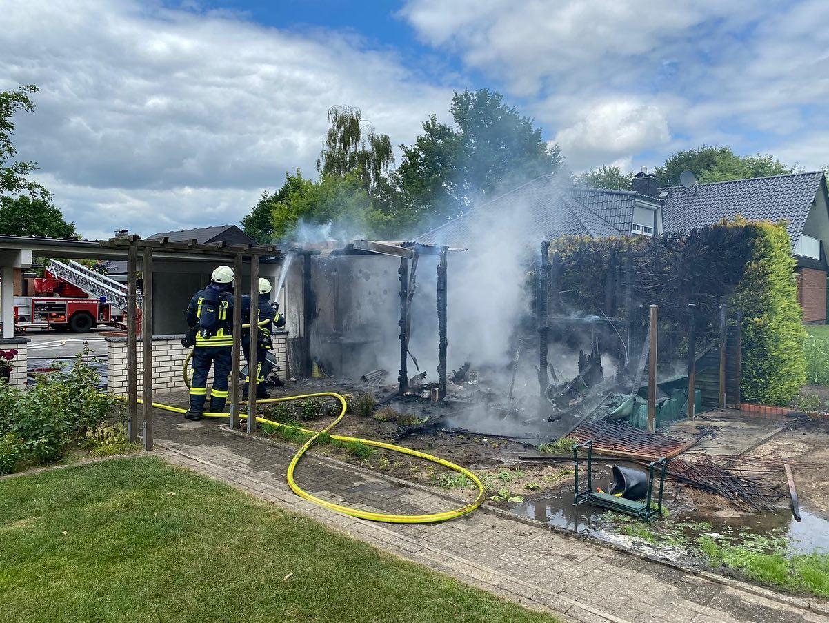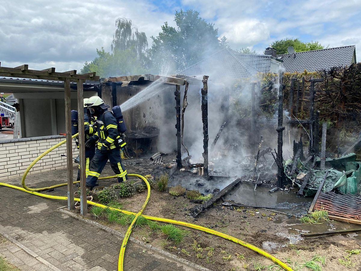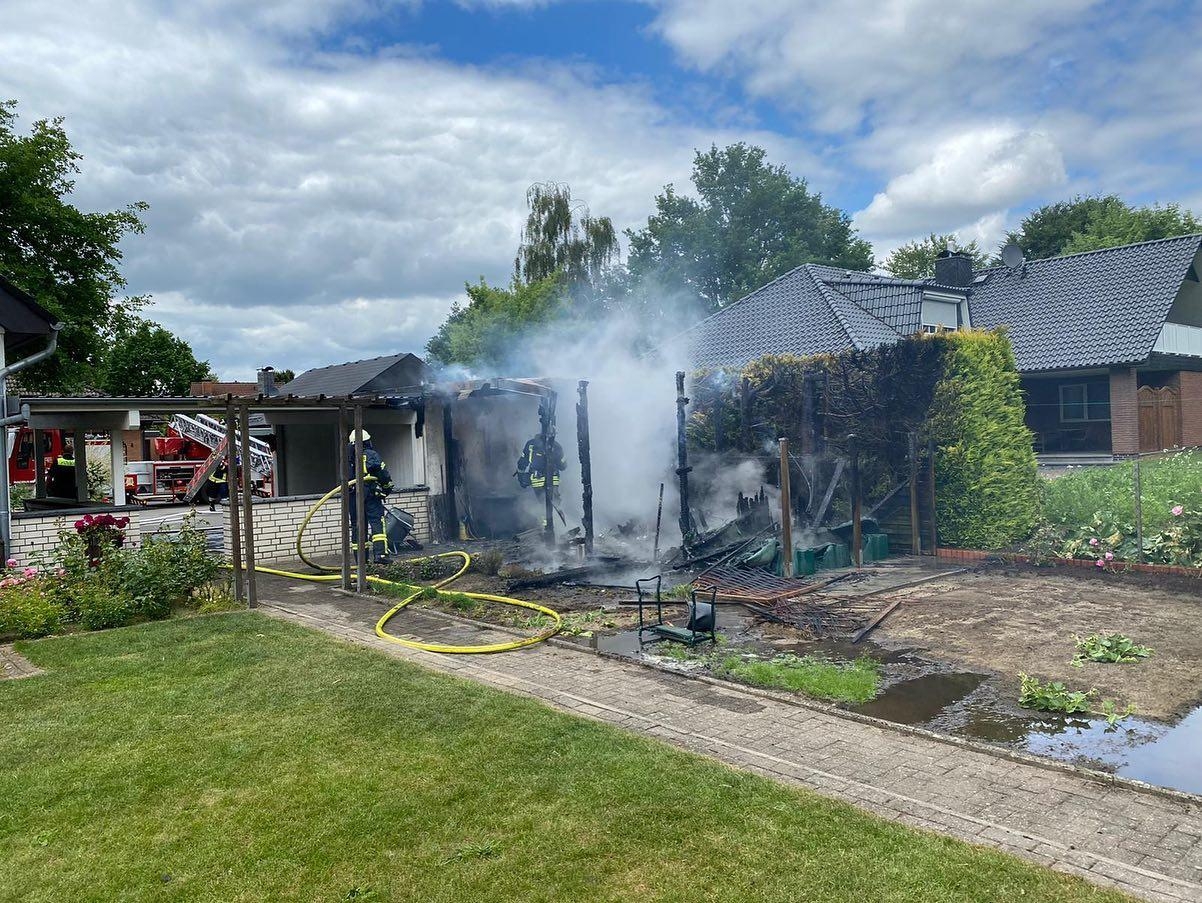 Ein Gartenschuppen stand in Vollbrand, eine angrenzende Garage mit einem Fahrzeug darin, befand sich in Gefahr. Zwei Trupps gingen unter Atemschutz zur Brandbekämpfung vor. Ein weiterer Trupp befand sich in sogenannter Bereitstellung. Die Feuerwehr Brauel stellte die Wasserversorgung vom Hydranten zum Löschgruppenfahrzeug her.
