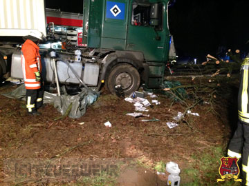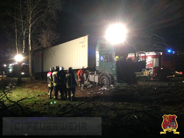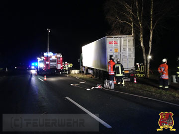 Bademühlen(tw) Obzwar das Jahr noch recht jung ist, so lassen die ersten Herausforderungen für die Feuerwehr nicht lange auf sich warten. Am Abend des 02.01.2014 wurde die Zevener Feuerwehr sowie die Führungsgruppe des Gefahrgut-und Umweltschutzzuges um ca. 22.30 Uhr zu einem Gefahrguteinsatz nach Verkehrsunfall alarmiert.Auf der Landstraße L122 von Zeven in Richtung Ostereistedt kam es kurz vor dem Ortseingang Ostereistedt zu einem Verkehrsunfall, infolge dessen ein Lkw mit Sattelauflieger von der Fahrbahn abkam und frontal gegen einen Baum prallte. Der Baum wurde dabei abgerissen und vom Lkw mehrere Meter weit weggedrückt. Beim Lkw entstand erheblicher Sachschaden, der Fahrer kam mit dem Schrecken davon und blieb unverletzt. Allerdings wurde auch der frisch gefüllte Kraftstofftank beschädigt, sodass größere Mengen Dieselkraftstoff austrat und in den Boden zu sickern drohte.