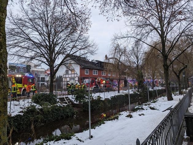 Gegen sieben Uhr war das Feuer weitestgehend unter Kontrolle. Da sich jedoch noch immer Flammen im Dachstuhl des Gebäudes befanden, musste das Dach geöffnet werden.