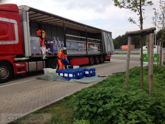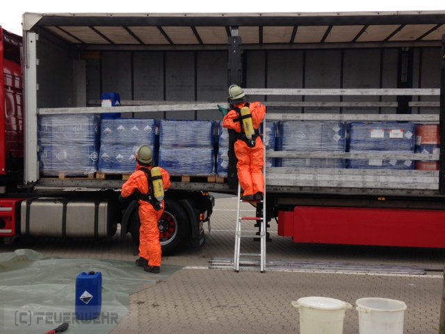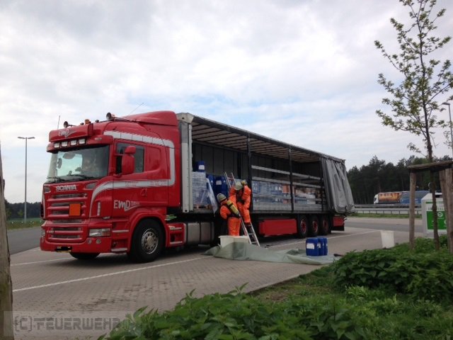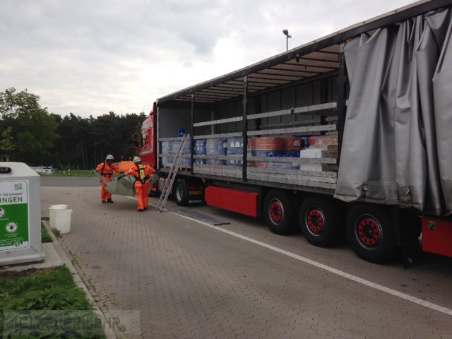 Hatzte(tw) Alarm für die Ortsfeuerwehren aus Elsdorf und Zeven sowie die Führungsgruppe des Gefahrgutzuges am 28.04.14 um 09:21 Uhr zu einem Gefahrguteinsatz auf dem Autobahnparkplatz Hatzte in Fahrtrichtung Hamburg. Während der Kontrolle eines niederländischen LKW durch die BaG (Bundesamt für Güterverkehr) sowie der Autobahnpolizei Sittensen stellten die Beamten fest, dass von der Ladefläche des Sattelaufliegers eine Flüssigkeit tropft. Da der LKW laut Ladepapiere diverses Stückgut mit Gefahrgut geladen hat, wurde umgehend die Feuerwehr angefordert. Nach Eintreffen der ersten Einsatzkräfte wurde umgehend ein Dekonplatz eingerichtet und ein Atemschutztrupp ist zur Lageerkundung auf den Sattelauflieger vorgegangen. Nach Rücksprache mit der Autobahnpolizei wurde zur Untersuchung der Ladung der Sattelauflieger durch die Einsatzkräfte zum Teil entladen. Hierbei konnte festgestellt werden, dass ein Gebinde auf einer Palette beschädigt wurde. Der beschädigte Kanister wurde durch die Einsatzkräfte in ein Überfass gestellt, damit nicht mehr von dem Stoff auslaufen kann. Da der Fahrer des LKW mit dem ausgelaufenden Stoff in Berührung gekommen ist, wurde der Fahrer durch die Besatzung des Rettungswagen aus Zeven zur weiteren medizinischen Behandlung in das Krankenhaus nach Rotenburg transportiert. Nach Bergung des beschädigten Kanisters wurde die Einsatzstelle an die Polizei übergeben.