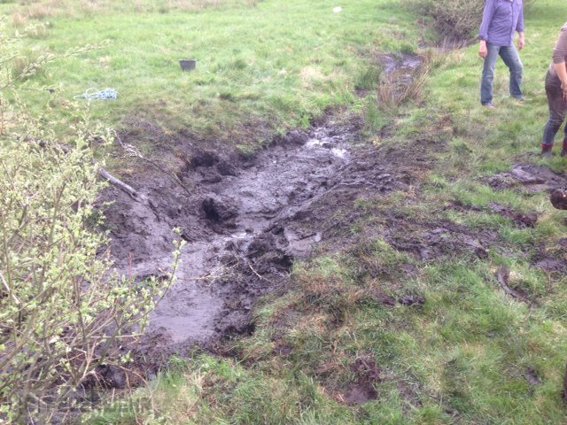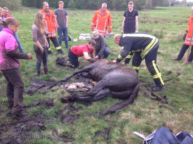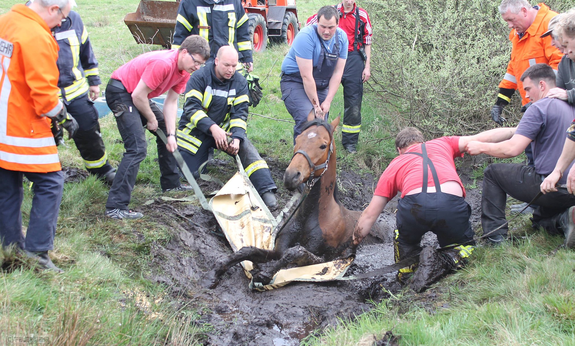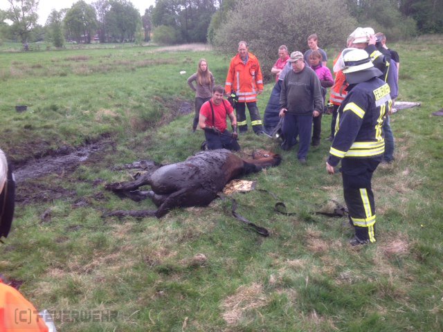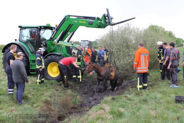 Wehldorf(tw) Alarm für die Ortsfeuerwehren aus Wehldorf und Gyhum sowie für den Gemeindebrandmeister Zeven am 30.04.14 um 16:45 Uhr zu einer Tierrettung in Wehldorf. Nach Eintreffen der ersten Einsatzkräfte steckte ein Pferd bis zum Hals in einem Graben fest und konnte aus eigener Kraft nicht mehr heraus kommen. Nach dem der 1. stellv. Gemeindebrandmeister Zeven an der Einsatzstelle eingetroffen war, hat er umgehend die Ortsfeuerwehr Zeven mit Drehleiter und Rüstwagen nachgefordert. Auf der Drehleiter Zeven ist ein spezielles Hebegeschirr für Tiere verlastet. Da die schweren Einsatzfahrzeuge nicht direkt an die Einsatzstelle fahren konnten, wurde das Hebegeschirr an einen Traktor mit Frontlader montiert. Nach ca. 30 Minuten konnte das entkräftete Pferd an seine Besitzerin übergeben werden.